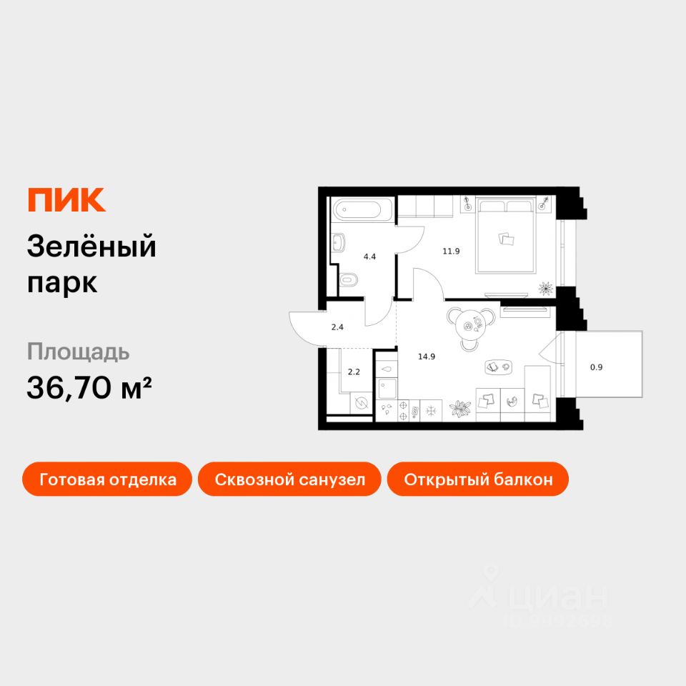 Продаётся 1-комн. квартира площадью 36,7 кв.м на 7 этаже 28 этажного дома (Корпус 5.4, Секция 5) проекта ПИК Зелёный парк. Светлый просторный подъезд на уровне земли, функциональная планировка, большие окна, c отделкой.
