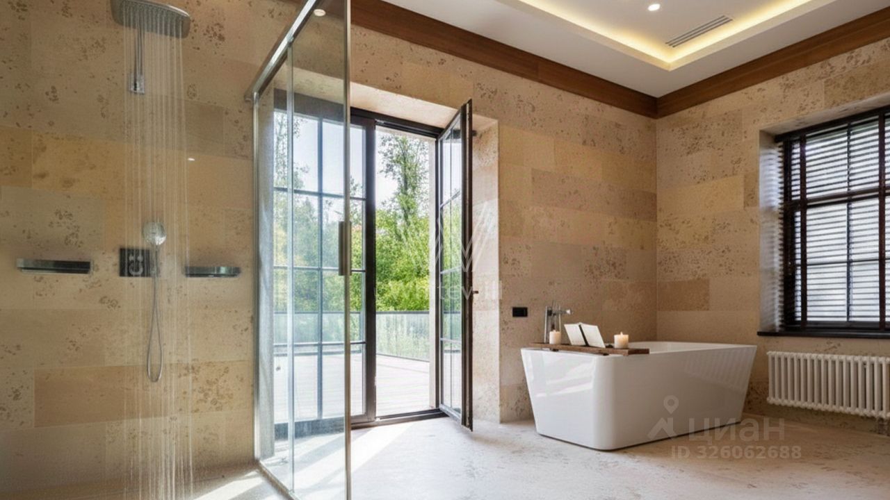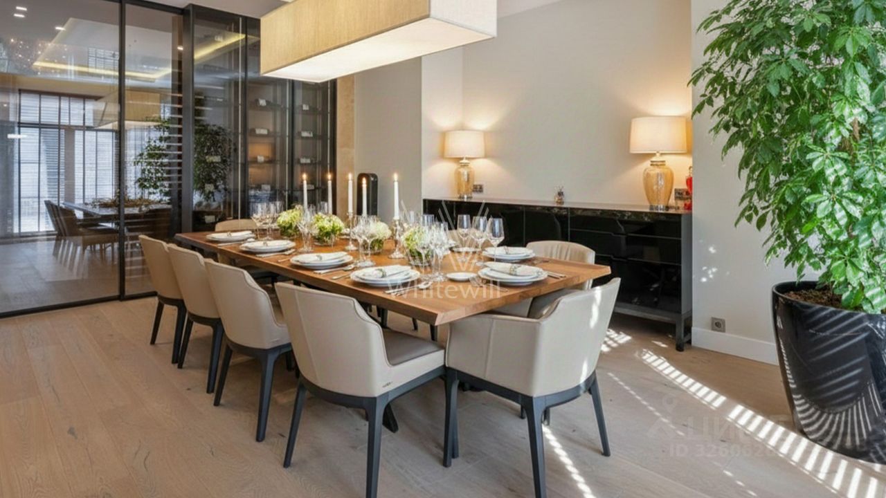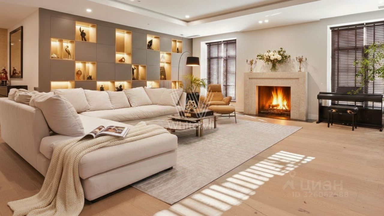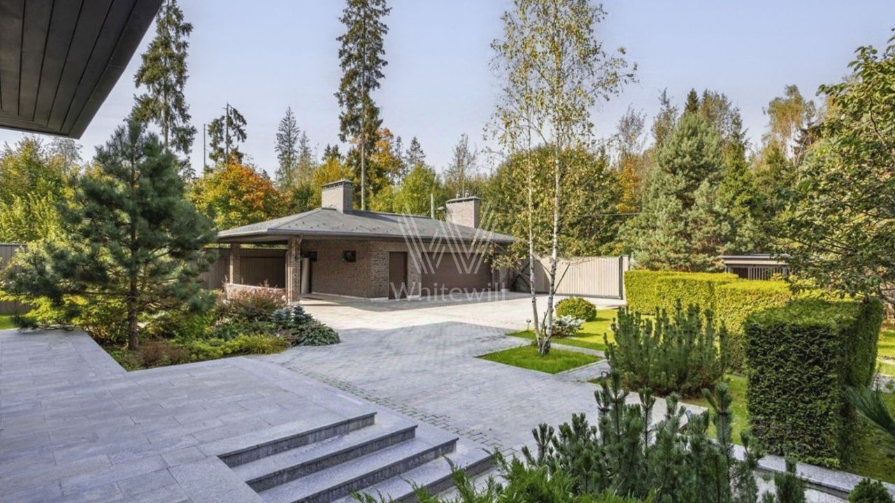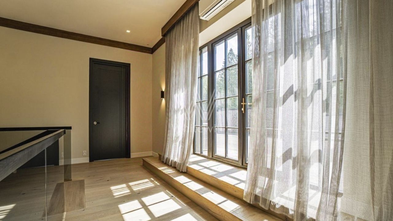 Светлые дизайнерские интерьеры отделаны с применением натуральных материалов: травертина, ценных пород дерева и мрамора. На полу уложены инженерная доска Finex и плитка с подогревом. Коттедж укомплектован элегантной мебелью от ведущих производителей, бытовой техникой Miele и Liebherr и сантехникой Villeroy&Boch, а особую атмосферу формируют светильники Delta Light. Безукоризненный комфорт обеспечивают системы кондиционирования, приточно-вытяжной вентиляции Systemair и ''умный дом'' от Control 4.