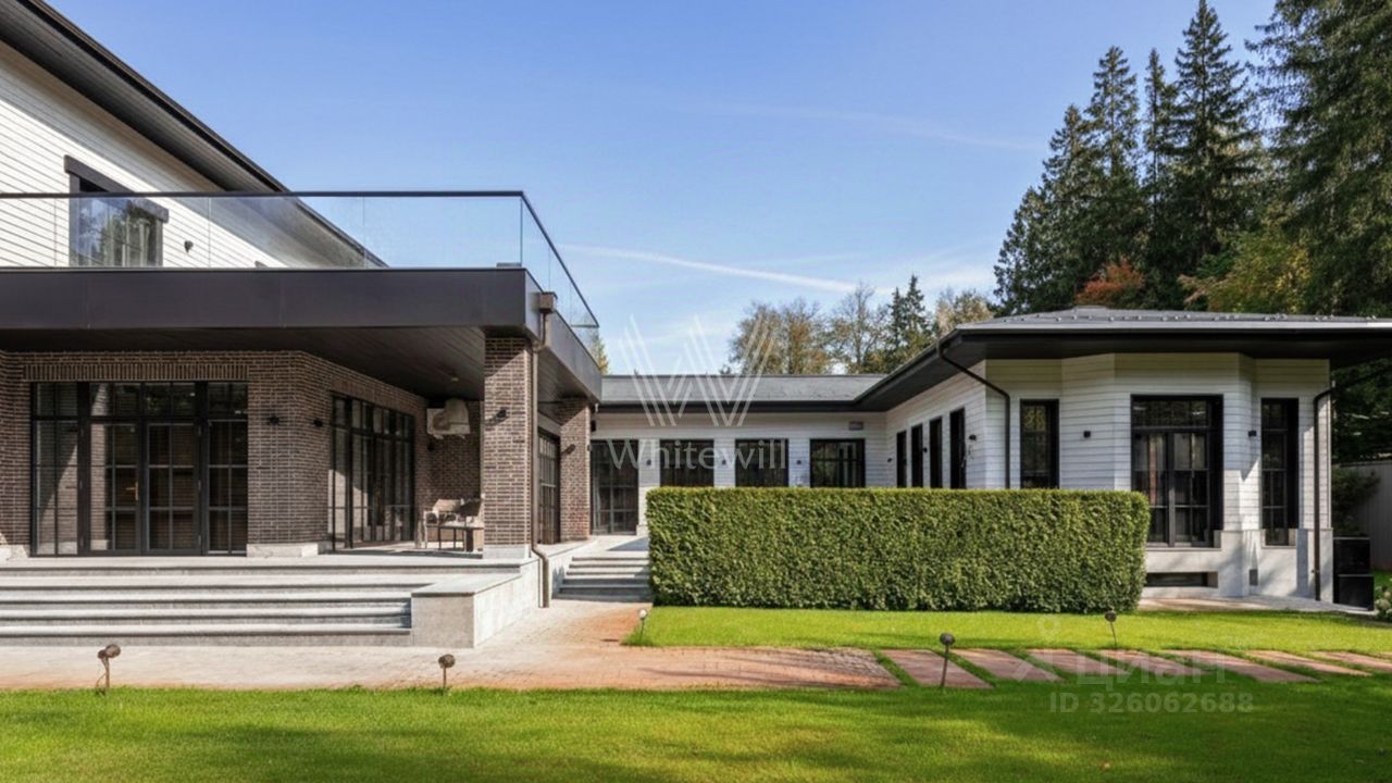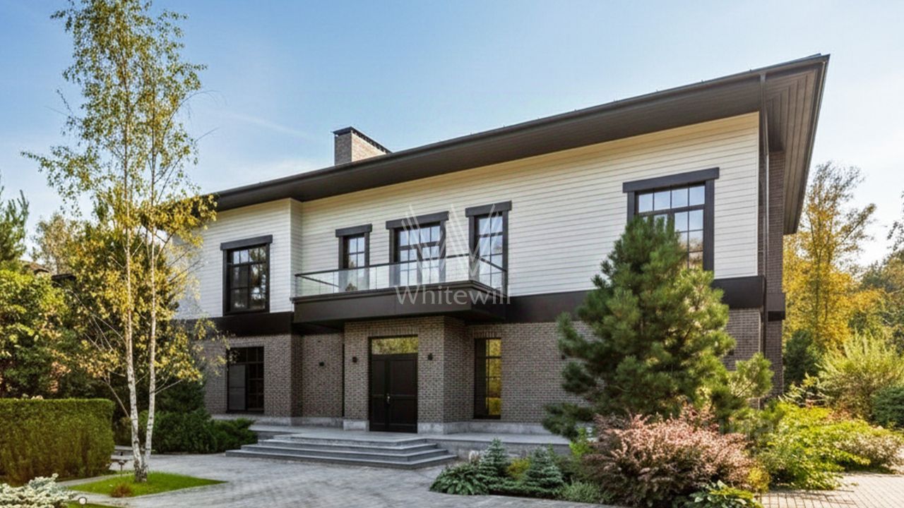 ВИК. Загородный особняк площадью 1000 м² расположен на участке 54 сотки с выходом в живописный лес. Фасад, сочетающий немецкий ригельный кирпич Feldhaus Klinker, лиственницу и гранит, создаёт современный образ, который с наступлением вечера подчёркивается стильной подсветкой.