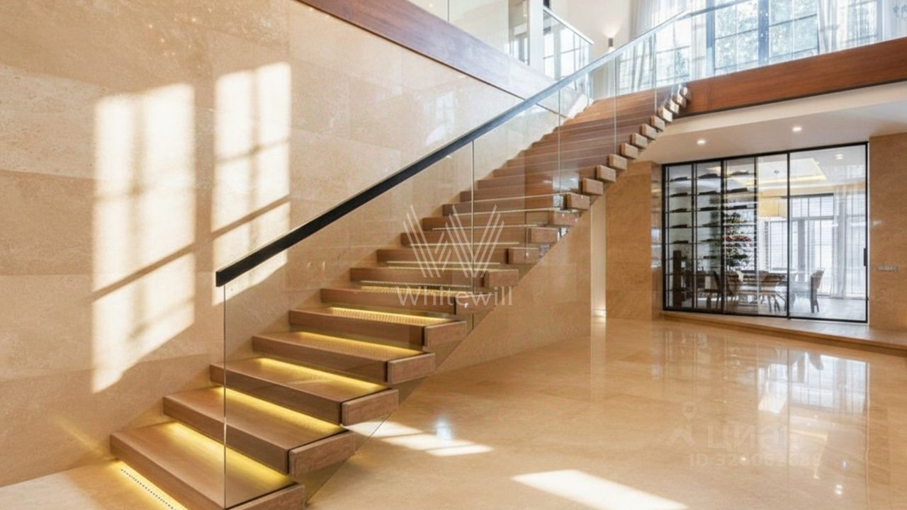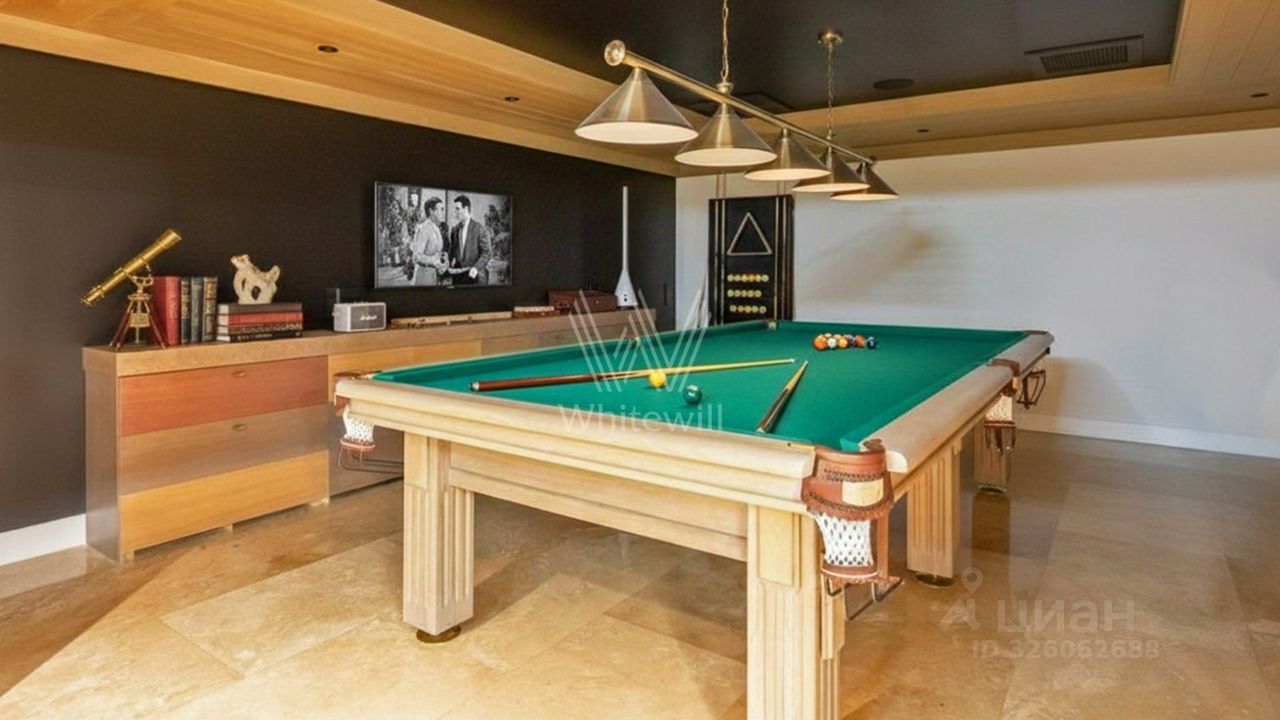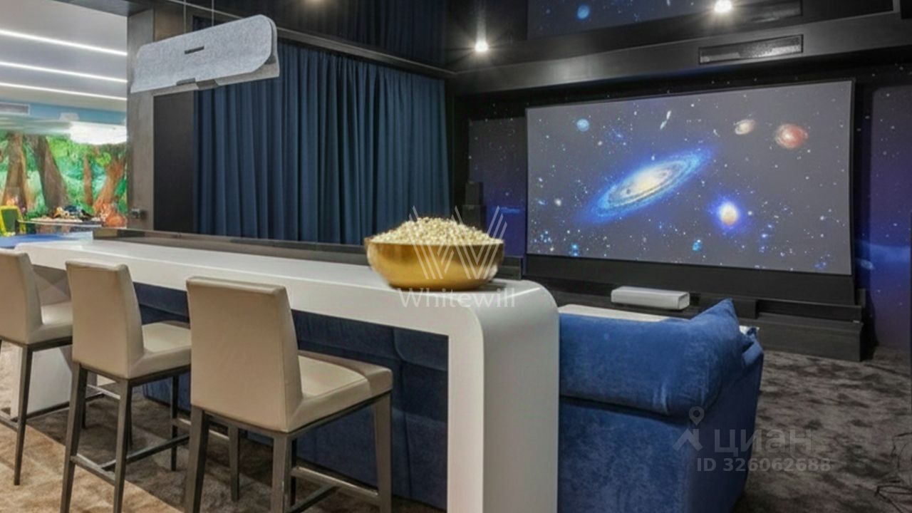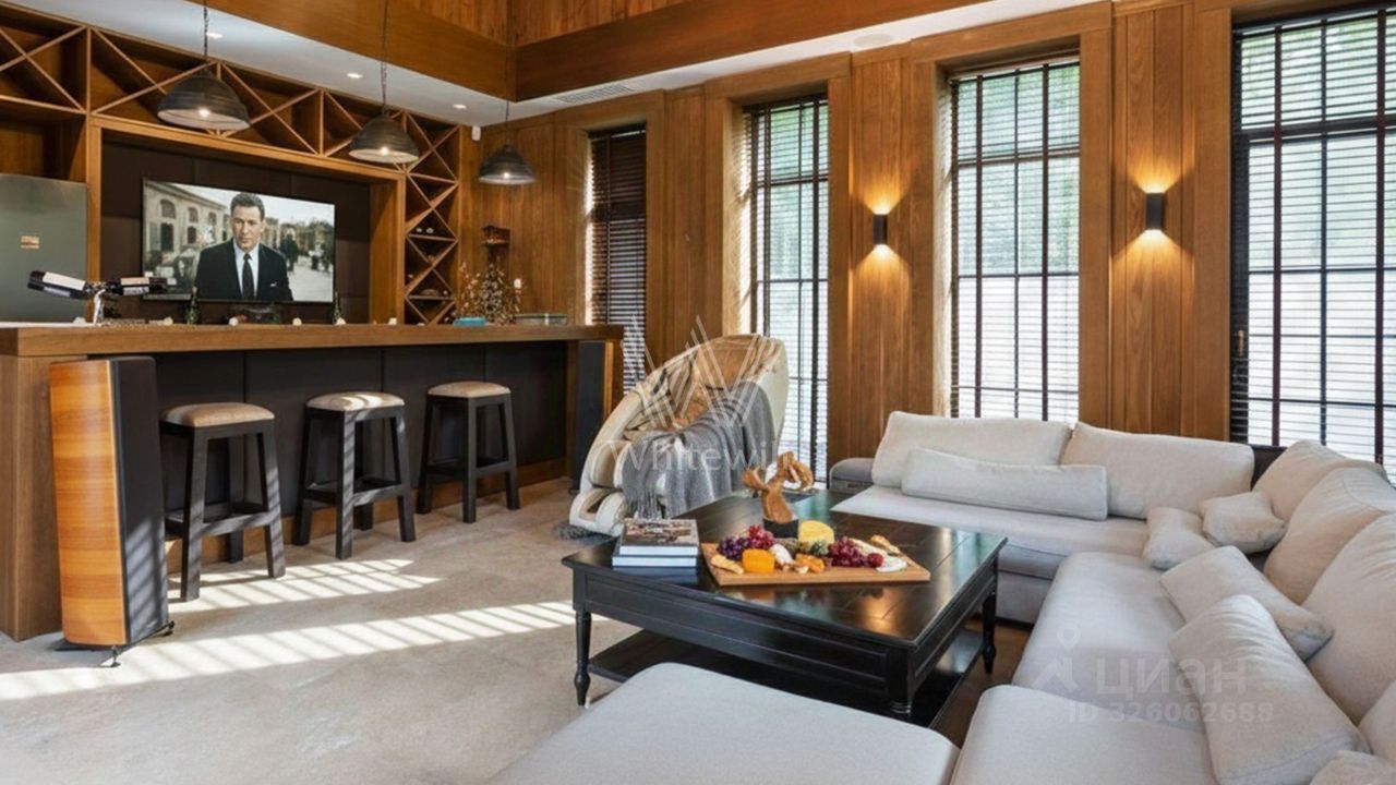 Первый уровень включает просторную гостиную с итальянским дровяным камином, кухню с гарнитуром Hank, столовую, кабинет, гостевую спальню и спа-зону с переливным бассейном длиной 10,5 метров, баней, отделанной канадским кедром, и баром с караоке. По эффектной ''парящей'' лестнице вы подниметесь на второй этаж — в приватную зону отдыха с тремя спальнями. Цокольный уровень посвящён развлечениям: здесь разместили кинозал, бильярдную-сигарную и тренажёрный зал. На террасе будет приятно насладиться закатом с чашкой кофе.