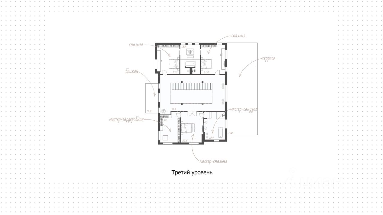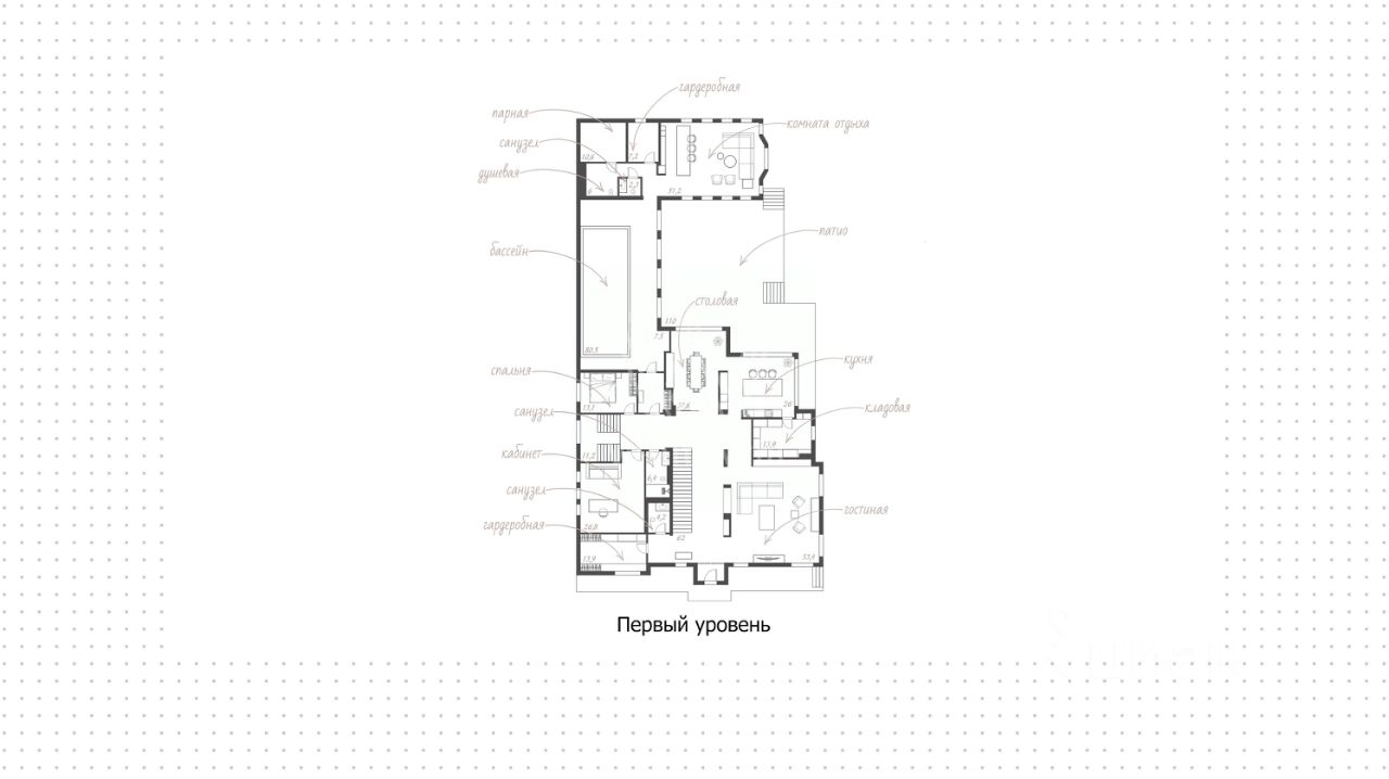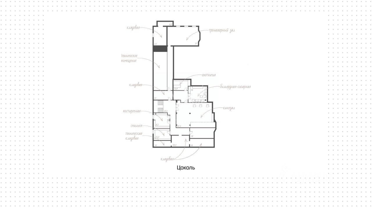 Поэтажное описание • Цоколь: кинозал, бильярдная-сигарная, охотничья комната, тренажёрный зал, постирочная, санузел, 4 кладовые, техническая кладовая, холодная кладовая, серверная-гардеробная, техническое помещение. • Первый уровень: холл, гостиная, кухня с кладовой, столовая, кабинет, спальня, два санузла, гардеробная, спа-зона с бассейном, баней, комнатой отдыха, раздевалкой, душевой и санузлом, патио, терраса. • Второй уровень: холл, мастер-спальня с гардеробной и санузлом, две спальни, санузел, терраса, балкон.