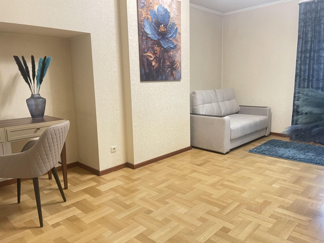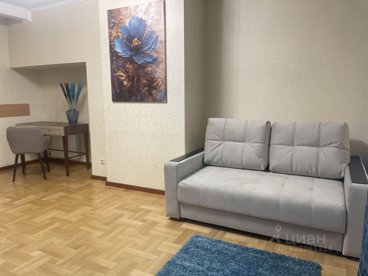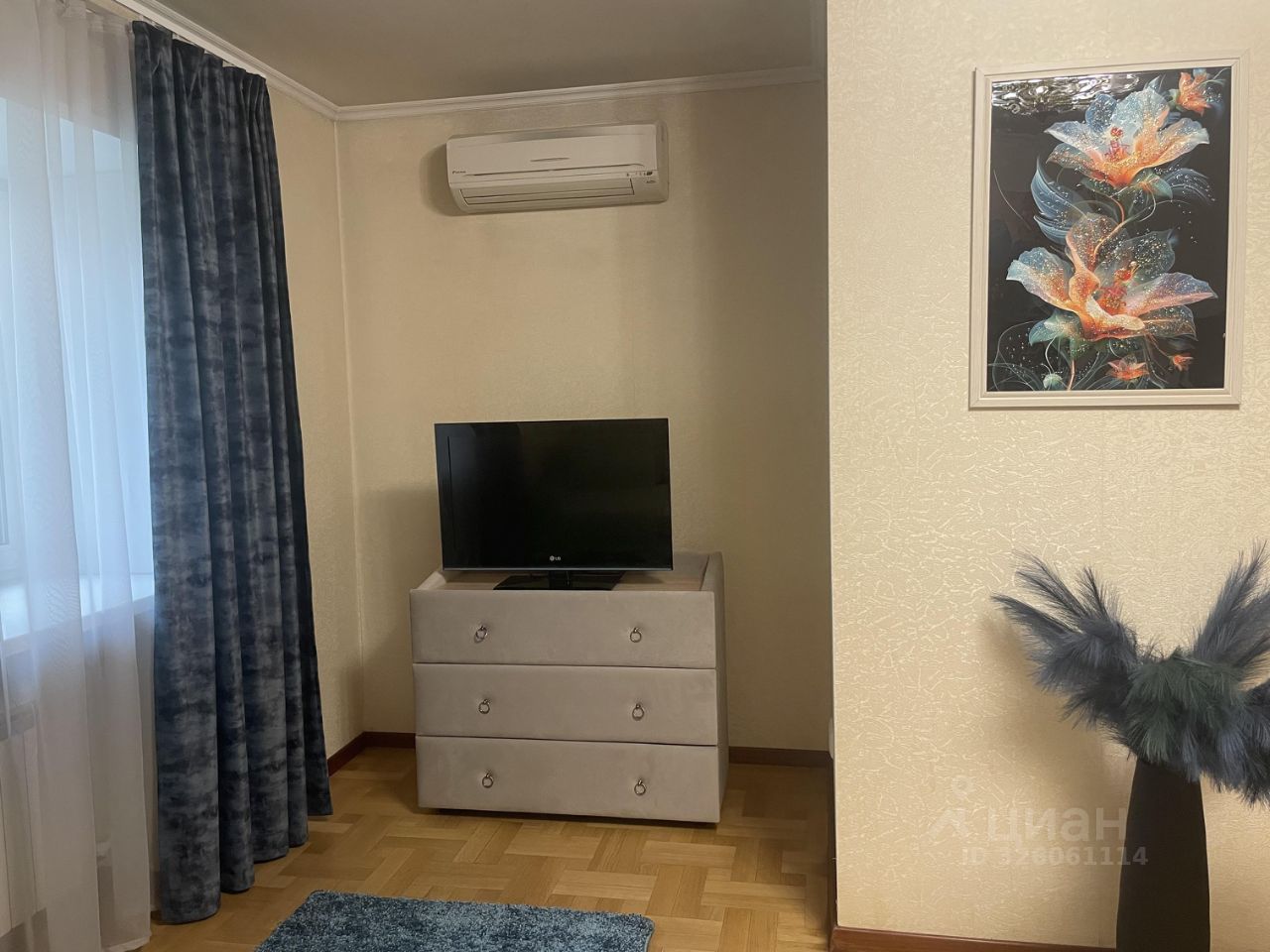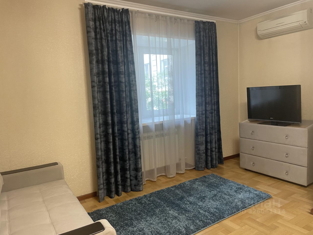 Гостиная для отдыха с раскладным диваном, телевизором и кондиционером. Также выделена зона для работы или можно использовать как бьюти уголок. В квартире имеется три вместительных шкафа.