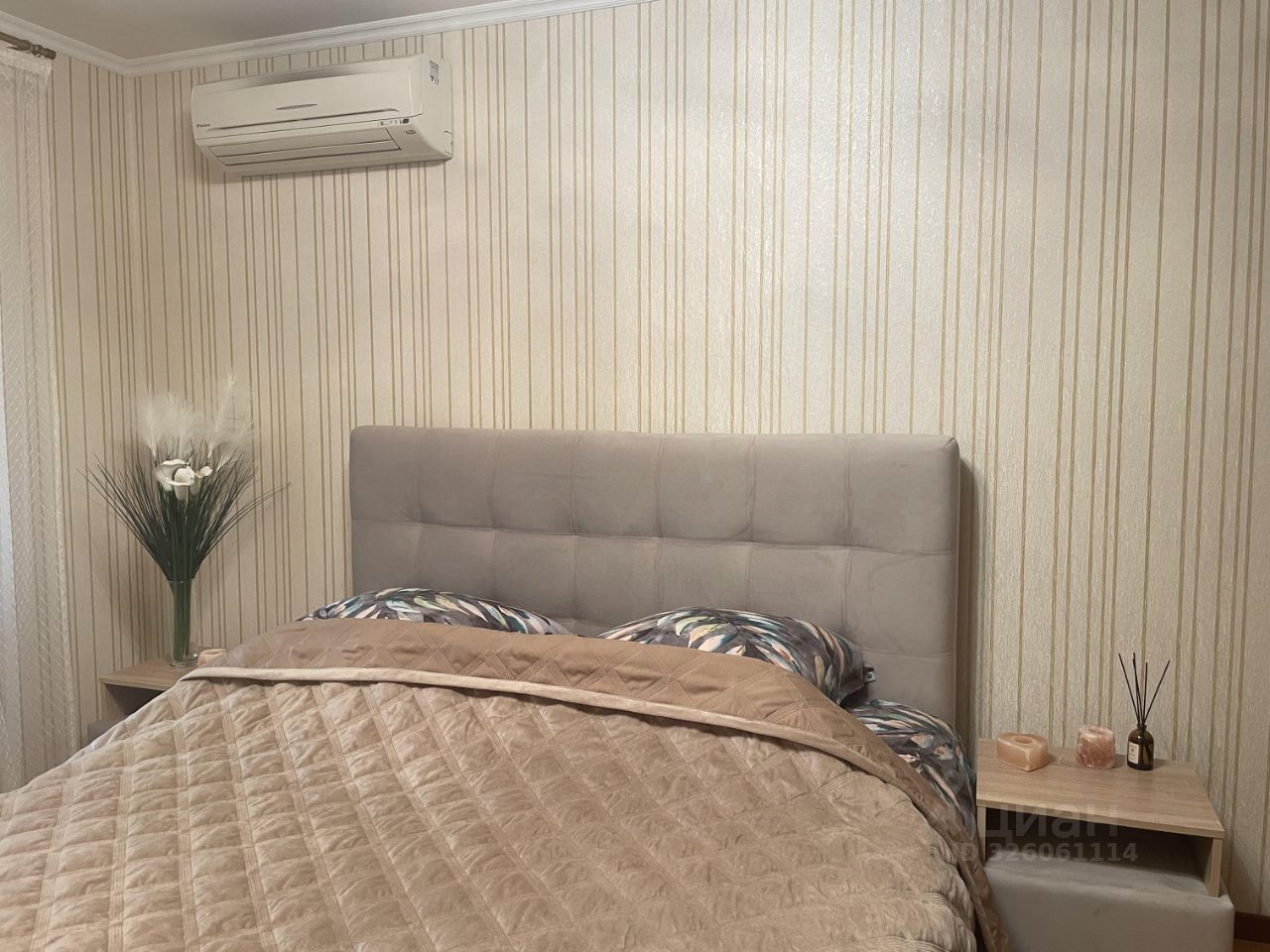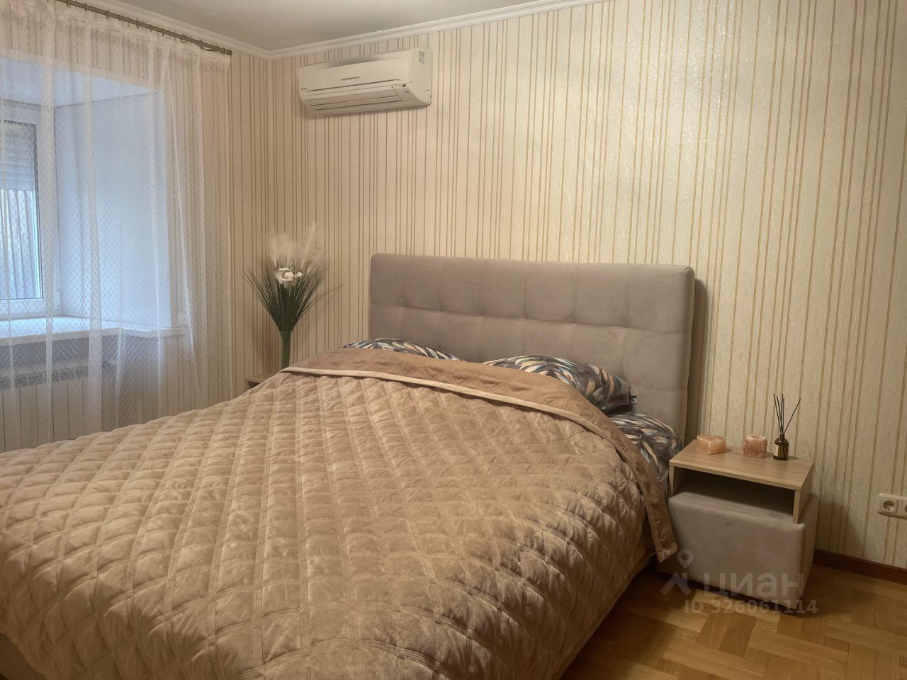 Спальня с новой кроватью и ортопедическим матрасом, есть вместительный шкаф и кондиционер.
