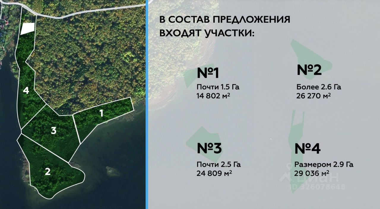 Детализация участков Участок 1: 1,5 га,Участок 2: 2,6 га,Участок 3: 2,5 га,Участок 4: 2,9 га. Все участки расположены на первой береговой линии, что существенно повышает их инвестиционную привлекательность.
