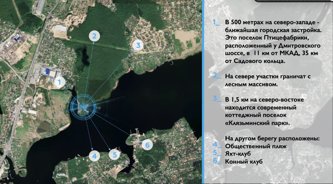 Ключевые преимущества Престижное расположение: берег залива Красная Горка — естественного нерестилища рыбы, с живописными видами и прямым доступом к воде.Особая категория земель: участки относятся к особо охраняемым территориям, гарантируя экологическую чистоту района.Гибкое назначение: основное разрешённое использование — под парусный центр, но возможна реализация других рекреационных проектов.Транспортная доступность: 11 км от МКАД по Дмитровскому шоссе, 35 км от Садового кольца.Первая береговая линия: прямой выход к воде позволяет обустроить причалы, пляжи и зоны отдыха. Географическое положение