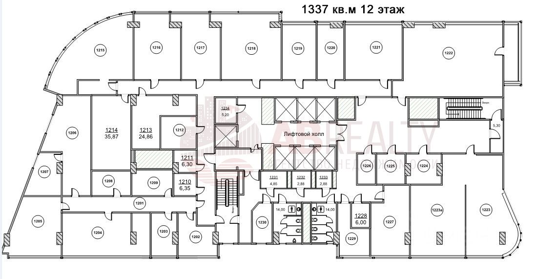 12 этаж. Офис 1337 кв.м. Панорамное остекление. Большое количество естественного света. Смешанная планировка: свои санузлы, мокрые точки. Высота потолков 3 м.