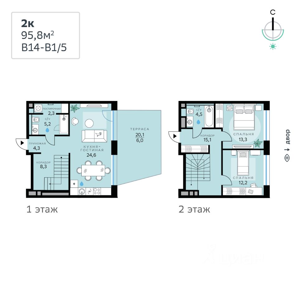 В продаже — двухкомнатная квартира, общей площадью 95,8 кв. м. Квартира расположена на первом этаже десятиэтажного корпуса Балансд в квартале В14 нового района СберСити, который строит Сбер.
