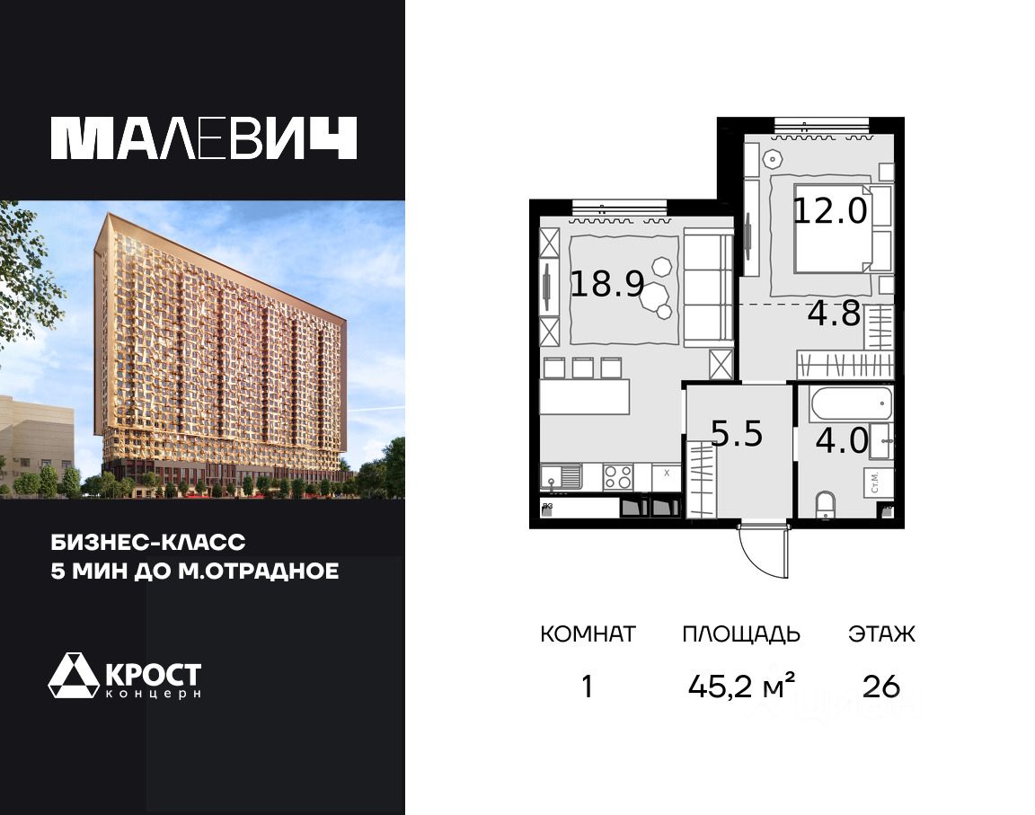 Продаётся 1-к квартира 45.2 кв.м. на 26-м этаже 28 этажного дома. Без отделки. Срок сдачи: 1 кв. 2026 г.