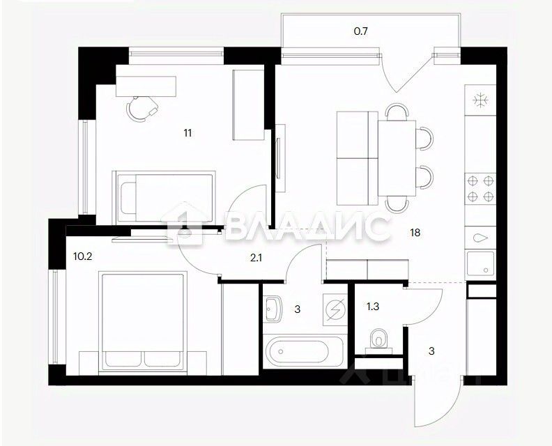 Общая площадь квартиры — 50 квадратных метров, из которых 21,2 — жилая площадь, а 18 — площадь кухни.