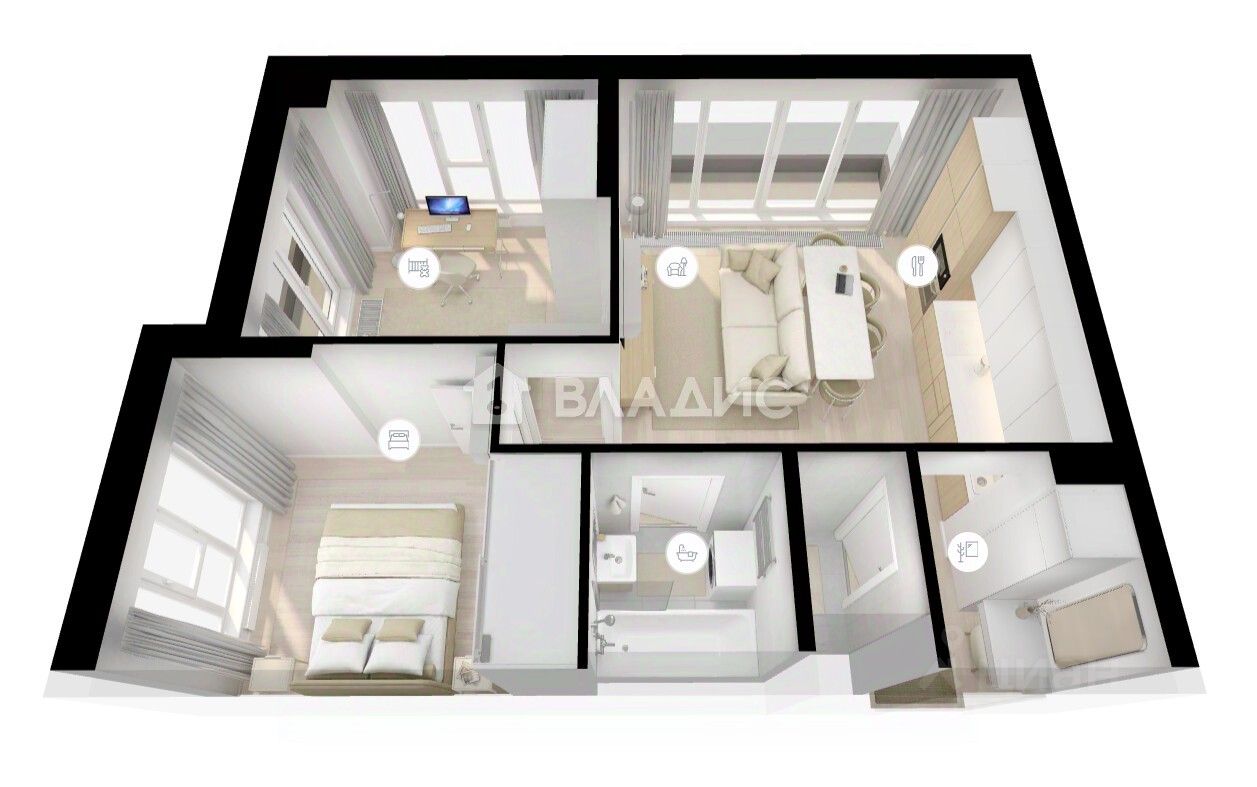 Квартира с готовым ремонтом, изолированными комнатами и одним раздельным санузлом, большими окнами в пол, с широким галерейным балконом.
