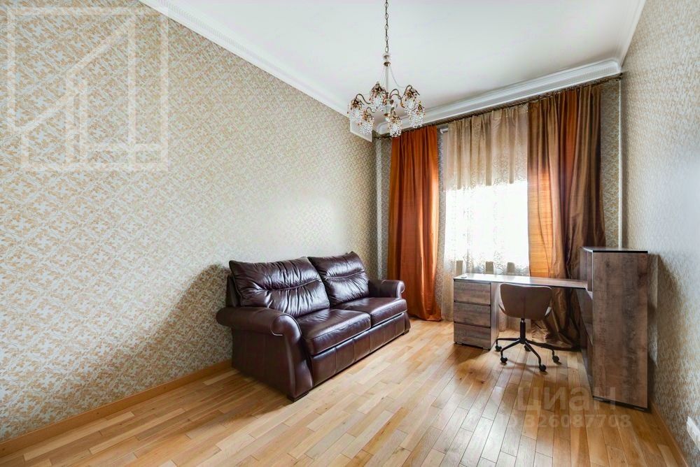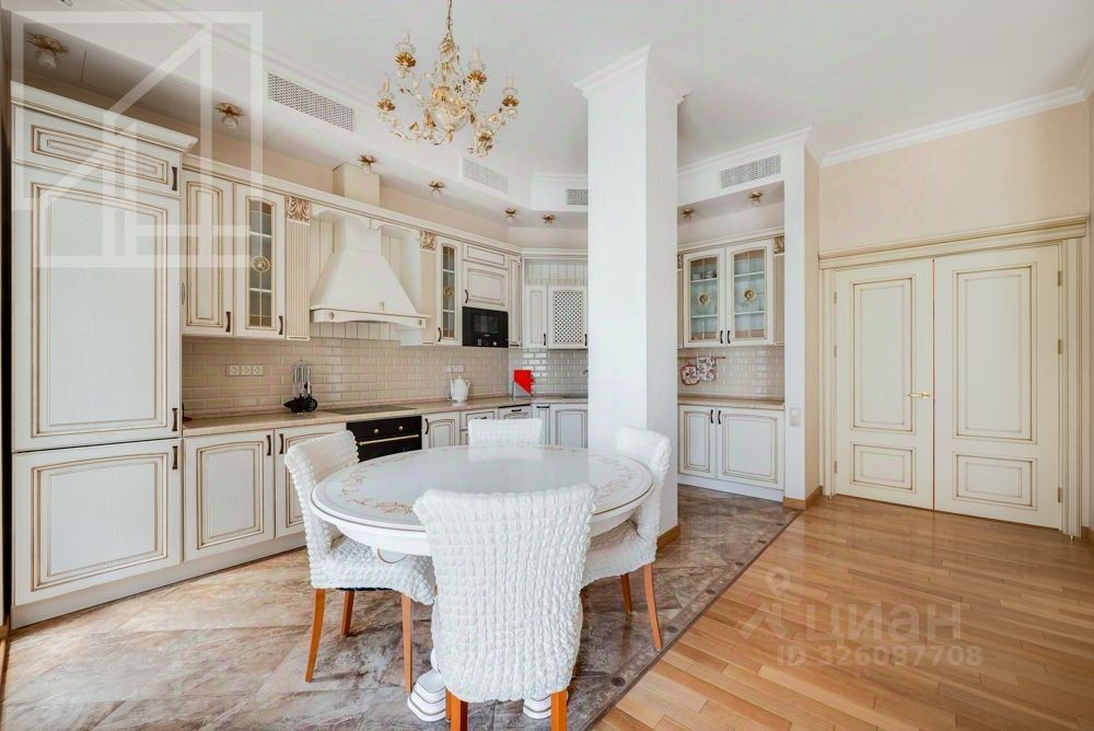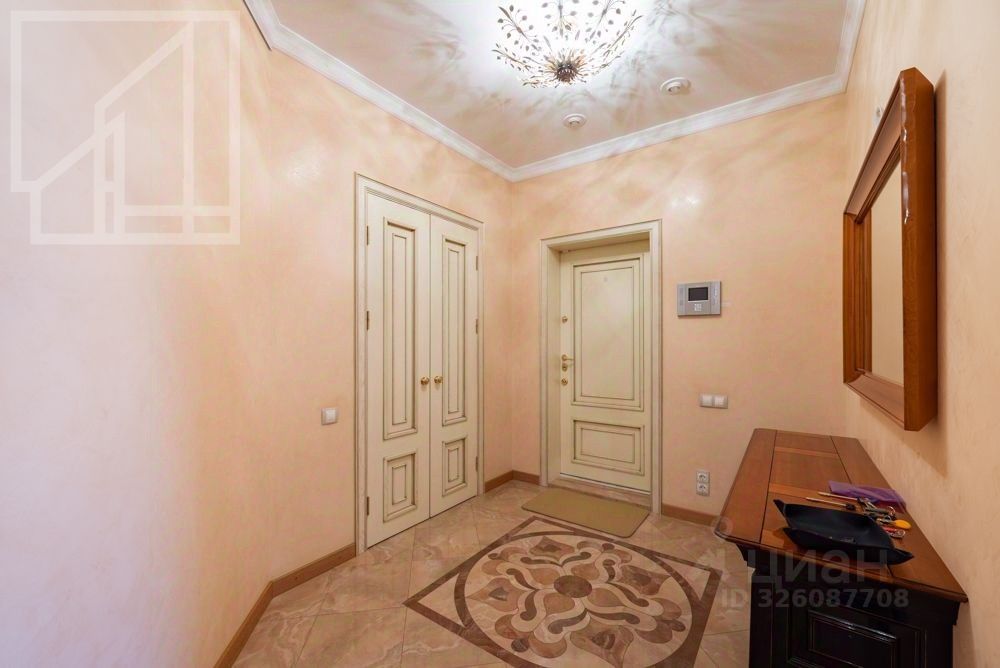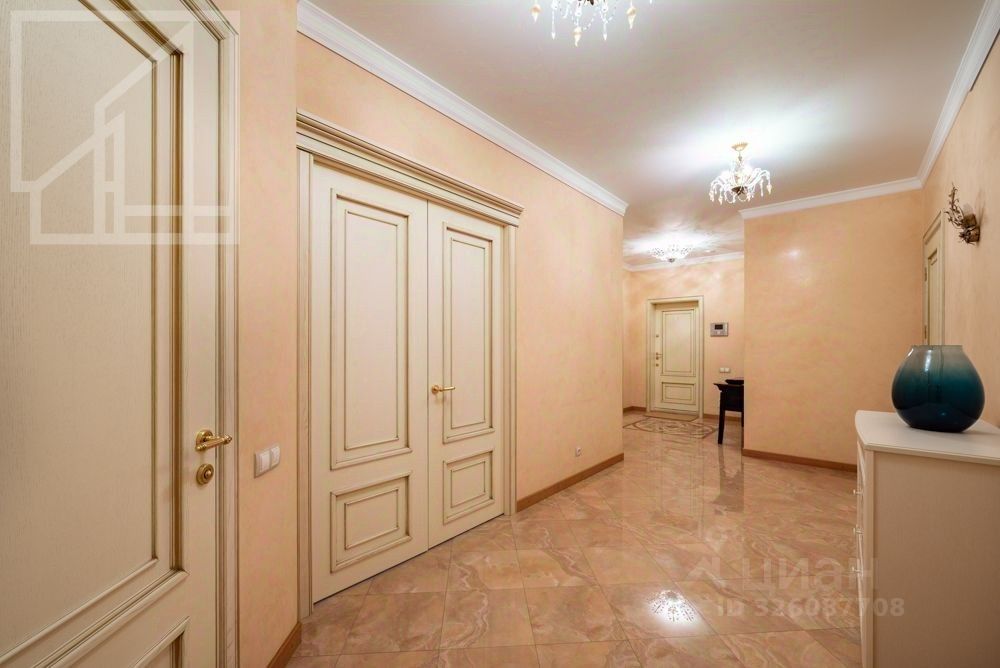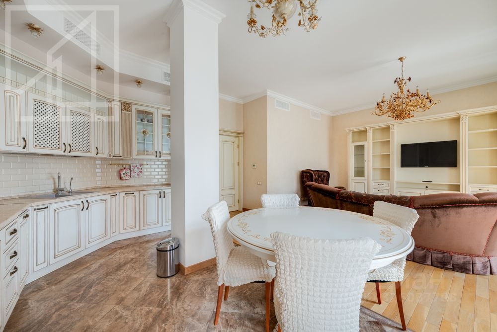Планировка: гостиная-кухня, две спальни, два санузла, гардеробная, лоджия. Высота потолков 3.2 м. Окна выходят на обе стороны. Ремонт выполнен в современном классическом стиле. Квартира полностью меблирована.