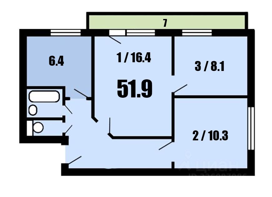 Общая площадь - 51,9 кв.м. без учета огромного балкона.
