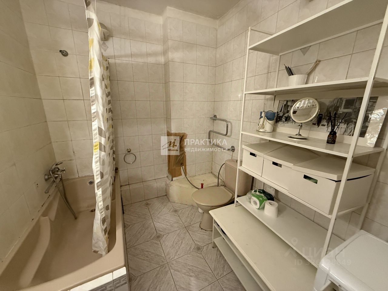 Большой совмещенный санузел с ванной и полками для хранения