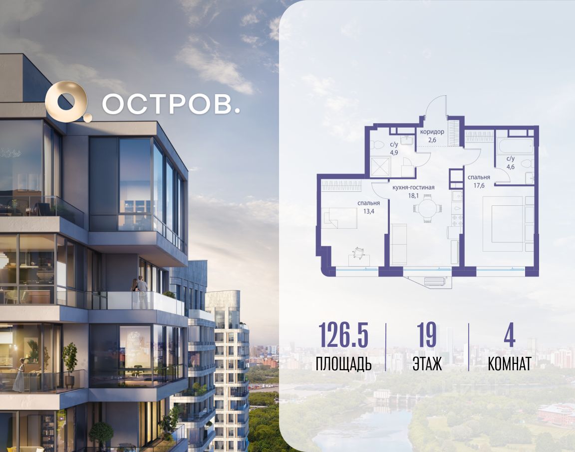 Продаётся 4-комн. квартира от застройщика: общая площадь 126.50 м², жилая м², кухня м², 19-й этаж, жилой квартал ''Остров 14'', корпус 6 (секция 1). Срок сдачи: 2 квартал 2029 года. . В жилой зоне 2 больших окна на одну сторону, хорошая инсоляция.