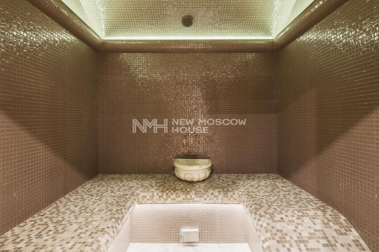 ремонт в современном стиле, панорамное остекление, высокие потолки, высокие двери, меблирован, СПА-зона с сауной, хамам, комнатой отдыха, гараж на 2 а/м, теплая терраса, уличный бассейн с подогревом, беседка, квартира для персонала.
