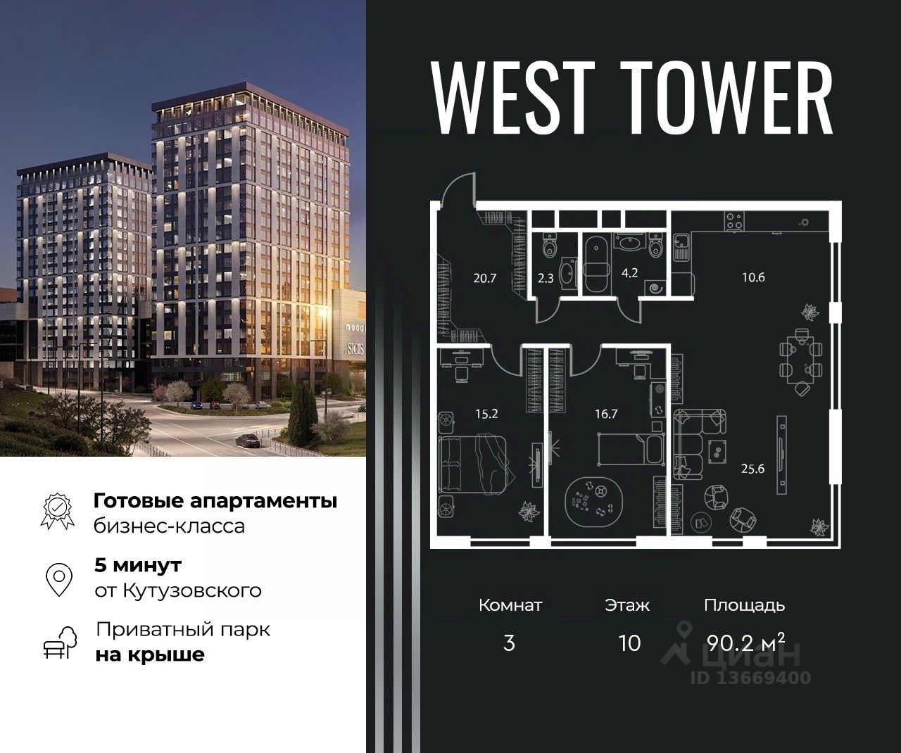 West Tower — апартаменты с премиальным сервисом на Аминьевском шоссе. Развитая инфраструктура и хорошая транспортная доступность. Рядом три станции метро: Аминьевская, Давыдково и Мичуринский проспект. У подножия коплекса находится Природный заказника Долина реки Сетунь, который дополнен собственным парком на крыше.
