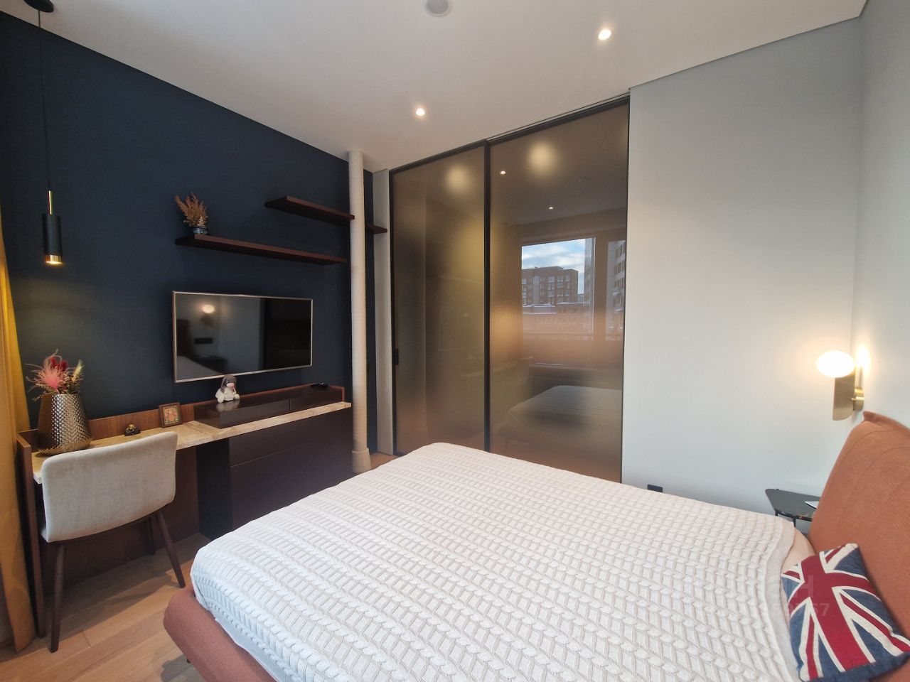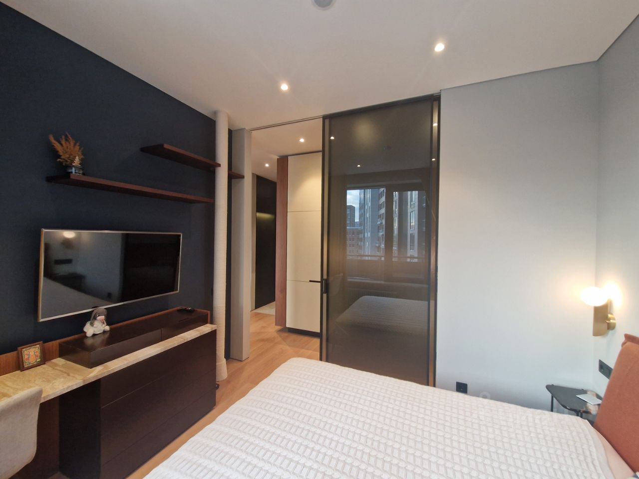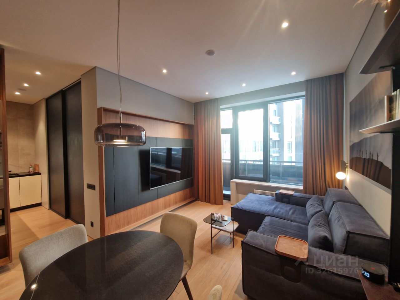 Большие окна и высокий уровень естественного освещения. Сплит система с двумя внутренними блоками. Теплый пол, система защиты от протечек, много декоративной подсветки, нагреватель воды, для удобства 2 душевые системы с тропическим и боковым, подоконники и стол из натурального камня, встроенный шкаф в прихожей, гардеробная комната, стиральная машина и сушильная, вся мебель выполнена на заказ, встроена по размерам. Кухня оборудована высококачественной техникой: варочной поверхностью, духовым шкафом, посудомоечной машиной, вытяжкой и холодильником.
