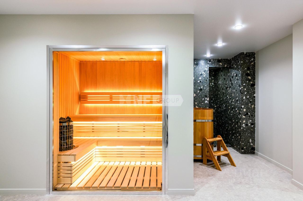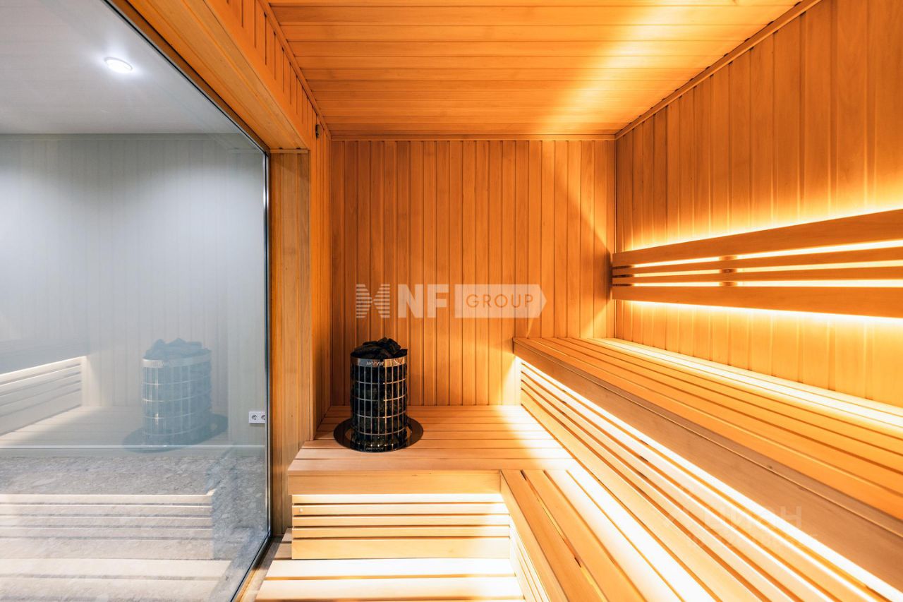 1 этаж: кухня-столовая и гостинуя с выходом на просторную террасу, 4 спальни, а также мастер-спальня с собственной гардеробной и выходом на балкон, 5 санузлов, зоны хранения, большой теплый гараж. В цокольном этаже: сауна с зоной отдыха, кладовые, постирочно-гладильное помещение, комнату для персонала, котельная.