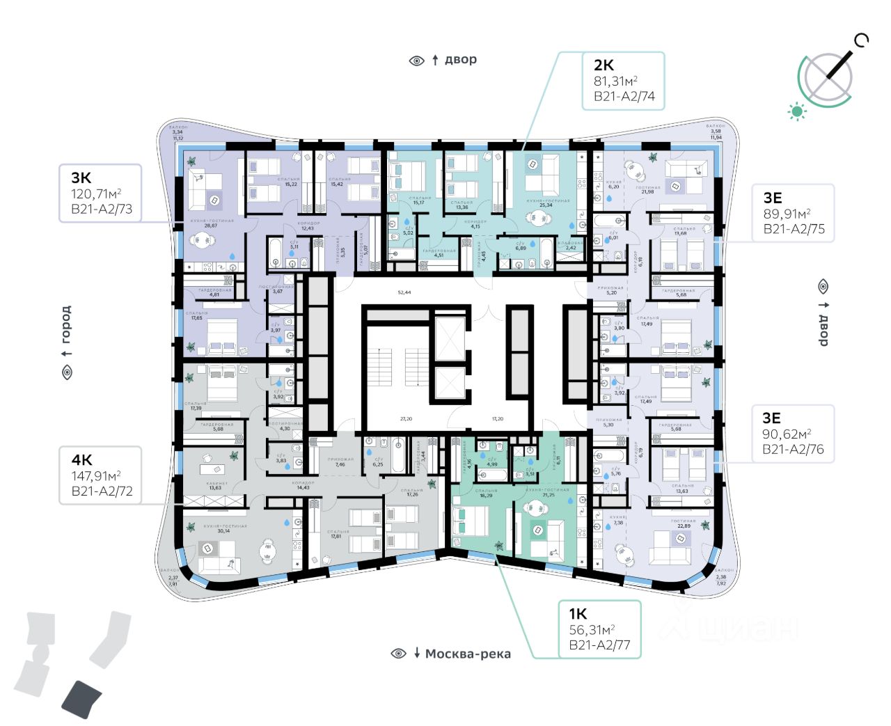 В продаже — двухкомнатная квартира, общей площадью 81,31 кв. м. Квартира расположена на тринадцатом этаже тринадцатиэтажной секции корпуса класса Адвансд в новом районе СберСити, который строит Сбер. Дом находится на второй береговой линии Москвы-реки.