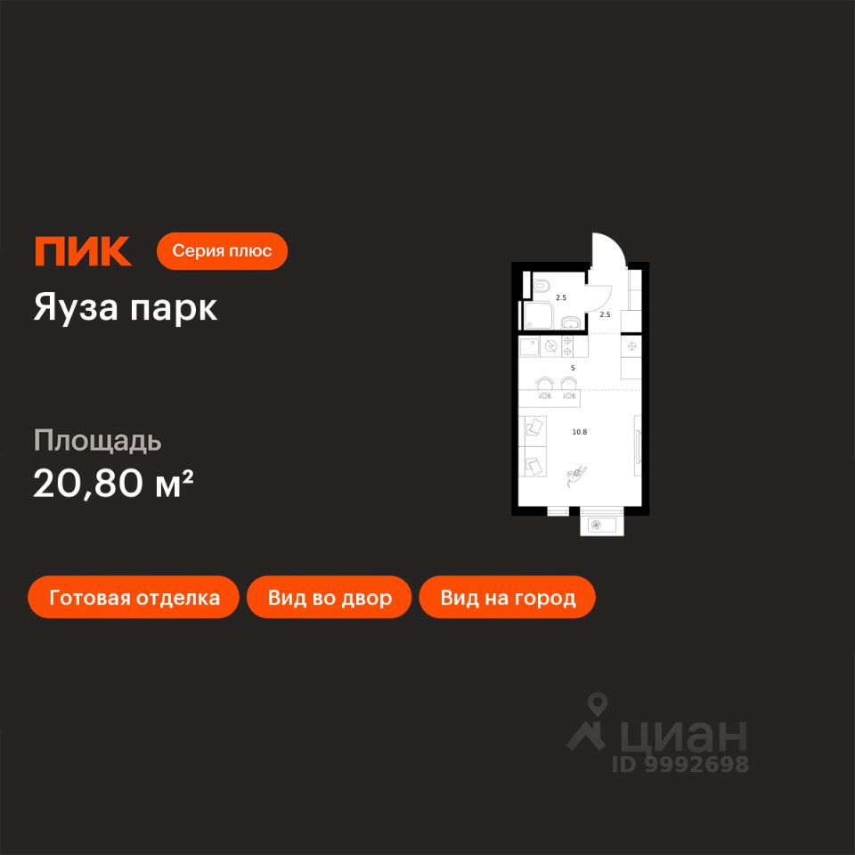 Продаётся квартира-студия площадью 20,8 кв.м на 4 этаже 24 этажного дома (Корпус 14, Секция 1) проекта ПИК Яуза парк. Светлый просторный подъезд на уровне земли, функциональная планировка, большие окна, c отделкой.