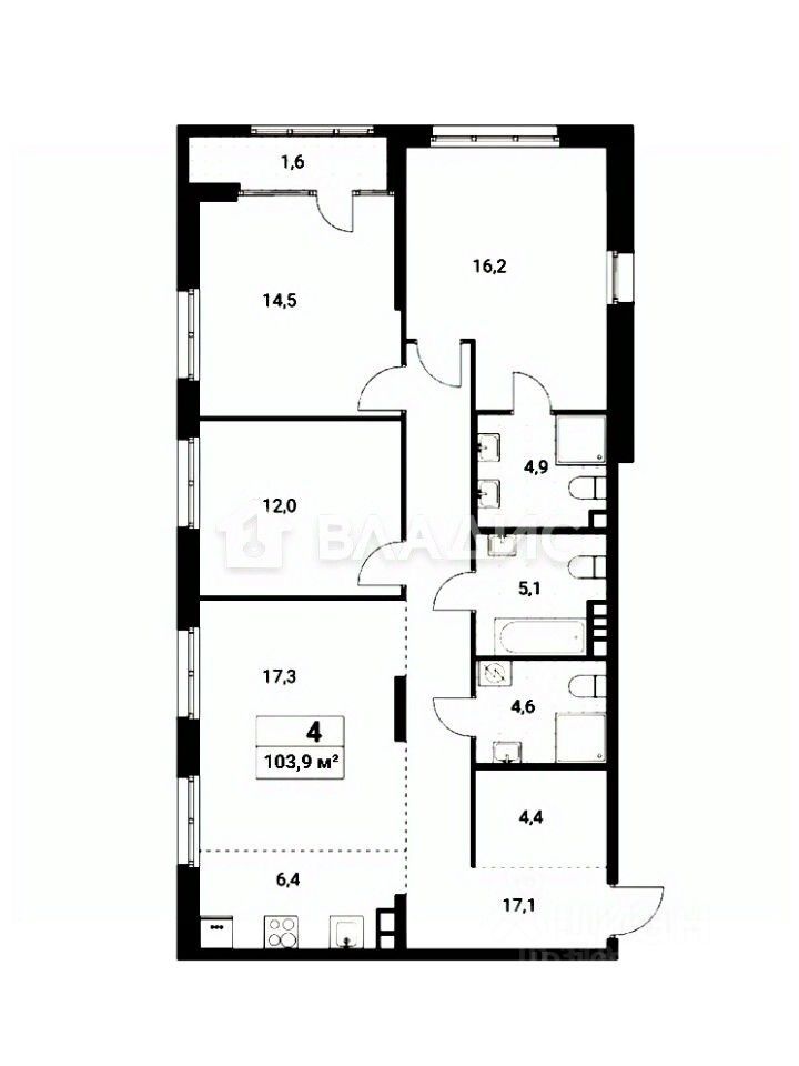Отличные видовые характеристики, окна на две стороны, есть лоджия. Мастер-спальня - 16.2 кв.м., комнаты 14.5 и 12 кв.м. и кухня-гостиная -23.7 кв.м.