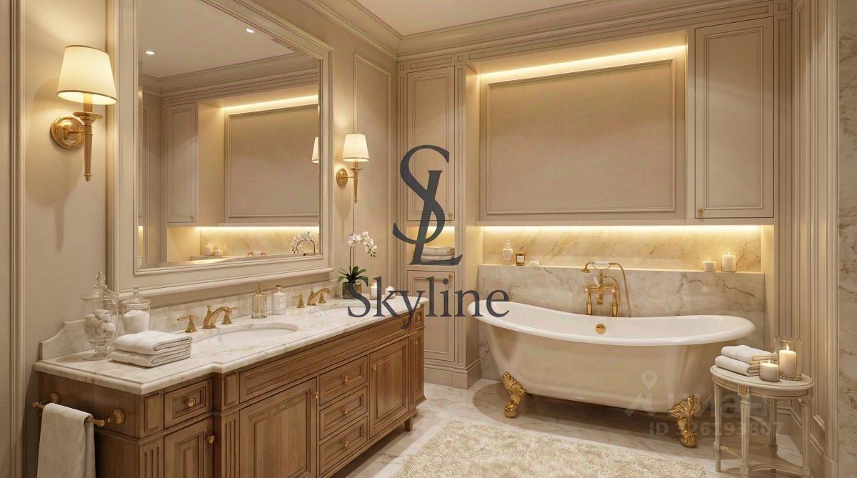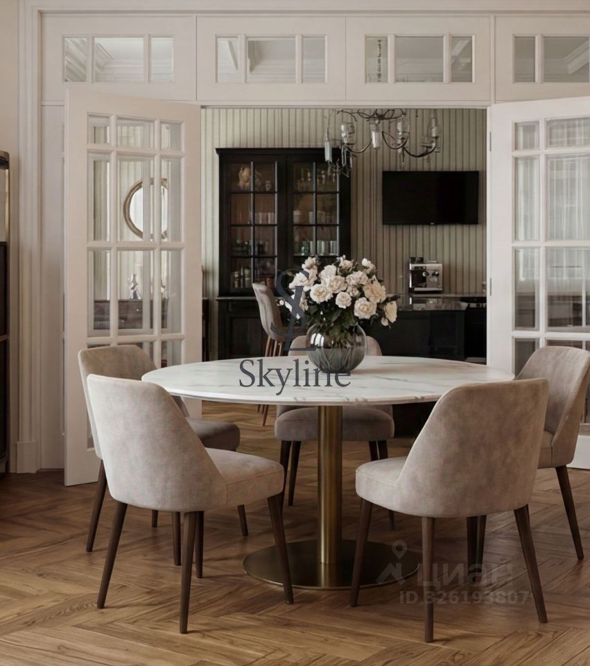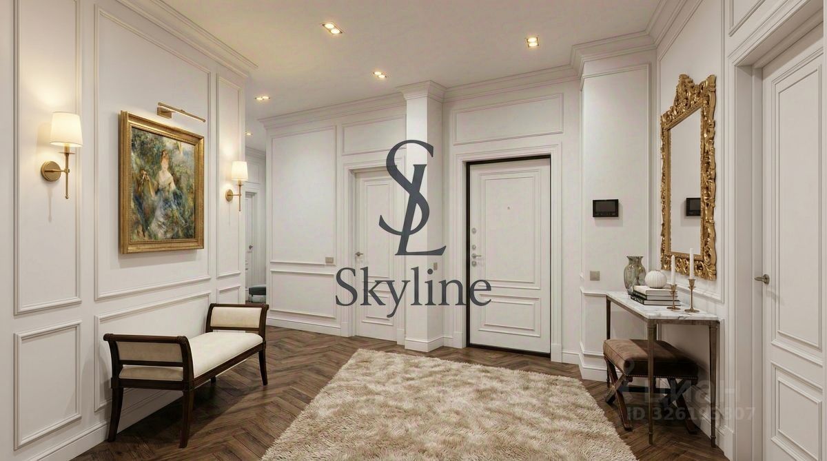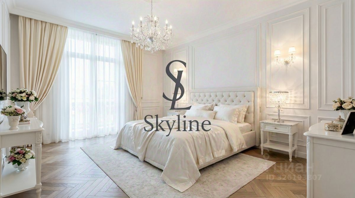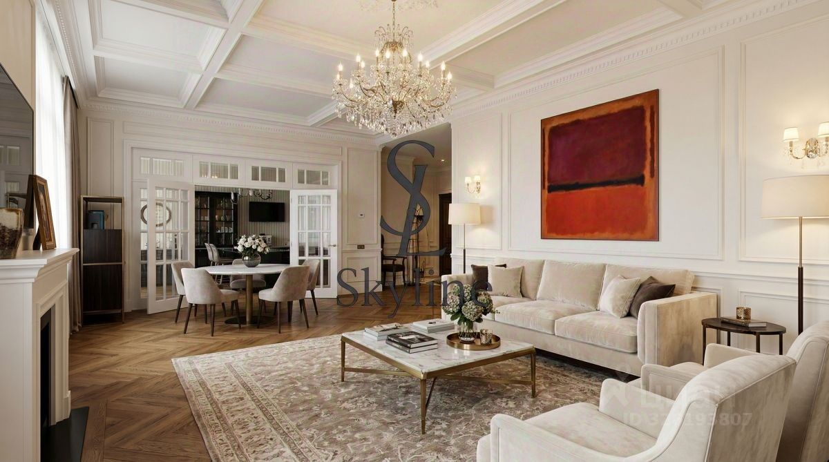 Просторная площадью 201 м², она занимает достойное место на пятом этаже и впечатляет авторской отделкой, выполненной в элегантном неоклассическом стиле. Интерьер украшен утонченными карнизами, многослойными потолками, эксклюзивными дизайнерскими люстрами, создающими гармонию света и уюта.