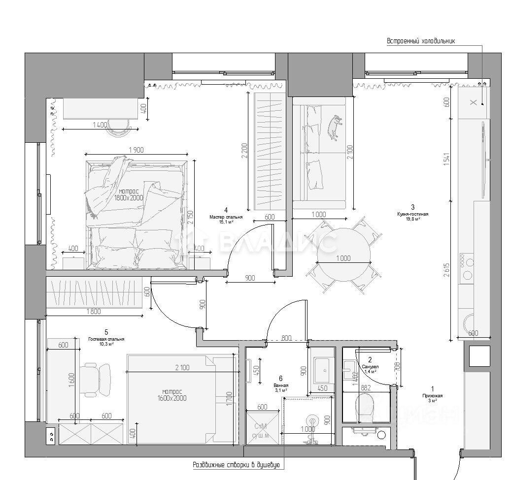 Планировка: большая кухня-гостинная и две спальни, два санузла, гардеробная.