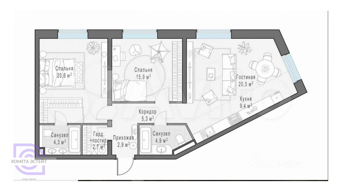 У вас есть уникальная возможность завершить интерьер по вашему вкусу, так как квартира продается с предчистовой отделкой. Вам остается только выбрать цветовые решения и мебель, что позволяет создать пространство, которое будет отражать вашу индивидуальность.