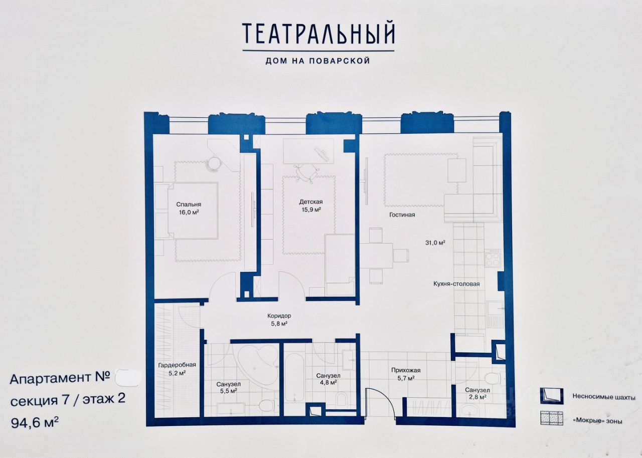 Лот: 314. БЕЗ КОМИССИИ. Трёхкомнатный апартамент класса люкс со свободной планировкой без отделки на 2 этаже элитного малоэтажного комплекса Театральный Дом. ЖК Театральный Дом, включающий в себя 8 секций от 4-7 этажей расположен в самом сердце Москвы близ пересечения Нового Арбата и Никитского бульвара. Из окон открывается вид на тихий зелёный сквер Мерзляковского переулка. Планировка: кухня-гостиная, две спальни, две ванные комнаты, один гостевой санузел. Высота потолков — 3,55 м. Есть два машиноместа по 19 кв.м и кладовое помещение 9 кв.метров, расположенные на -2 этаже (не включены в стоимость апартаментов). Бесшумные лифты высокого класса с дизайнерской отделкой кабин, индивидуальная вентиляция и система VRV во всех апартаментах, круглосуточная система контроля доступа, система видеонаблюдения. В доме предусмотрен полный комплекс телекоммуникационных услуг. В пешей доступности от Театрального Дома — Кремль, Храм Христа Спасителя, Охотный ряд, Белый дом, Остоженка, Пушкинская площадь, Пречистенская набережная и Патриаршие пруды. В пешей доступности расположены станции метро Арбатская, Библиотека им. Ленина и Пушкинская.