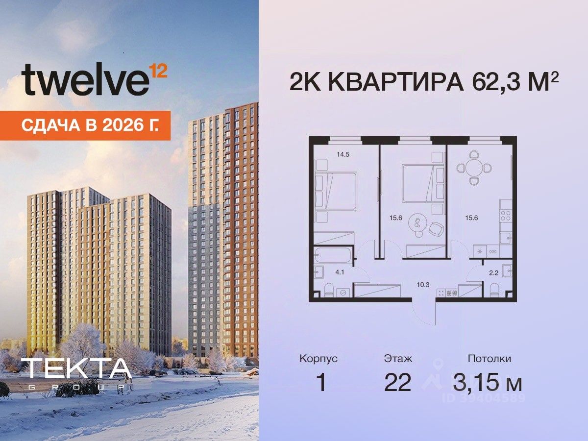 2-комн. квартира в ЖК ''Twelve'' на 22 этаже в 34 этажном здании Корпус 1. Общая площадь: 62.3 кв.м., жилая: 30.10 кв.м. Высота потолков 3.15 м.