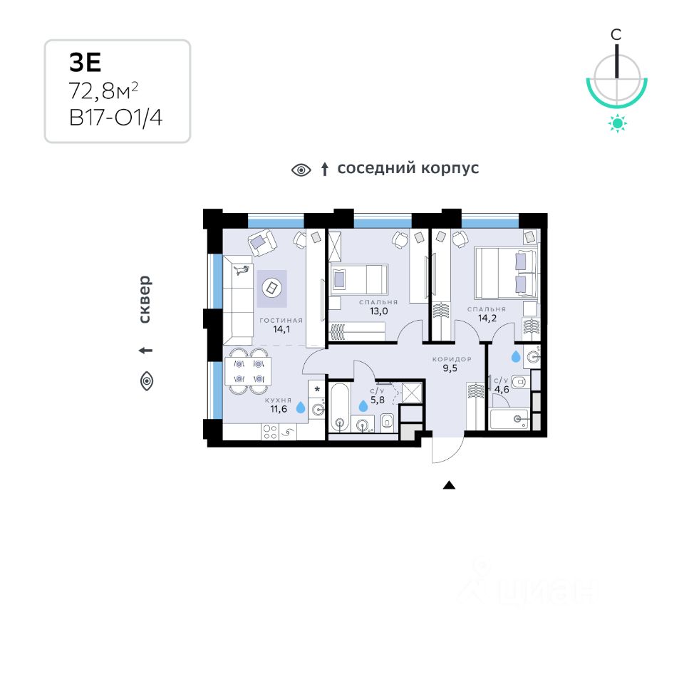 В продаже — двухкомнатная квартира, общей площадью 72,8 кв. м. Квартира расположена на втором этаже десятиэтажного дома класса Оптимум в квартале В17 нового района СберСити, который строит Сбер. Всего в доме — 55 квартир.