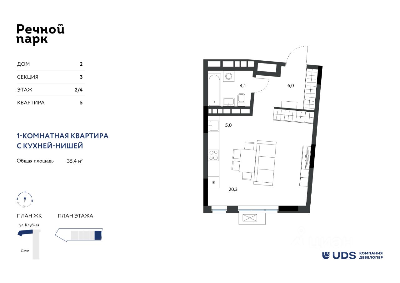 Квартира-студия расположена в 4-этажной секции ЖК ''Речной парк'' дом 2. Увеличенная площадь - 35,4 м2, объединяет функциональную жилую комнату с кухней-нишей и просторную прихожую, где уже запланировано место под шкаф для сезонной одежды. В санузле достаточно места для установки полноценной ванны и стиральной машины. В комнате 2 окна, выходят на юг, во двор. Комнаты светлые - уровень подоконника 60 см от пола, высота окна 1,7 м.