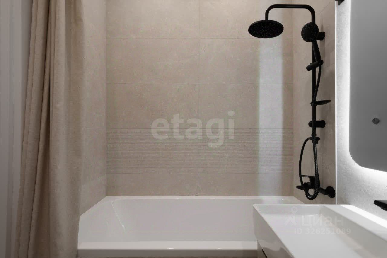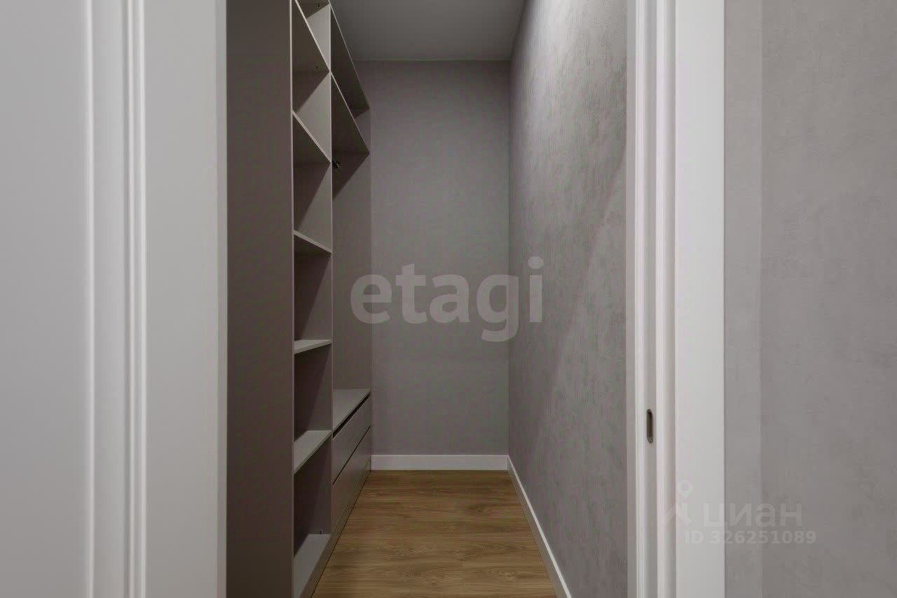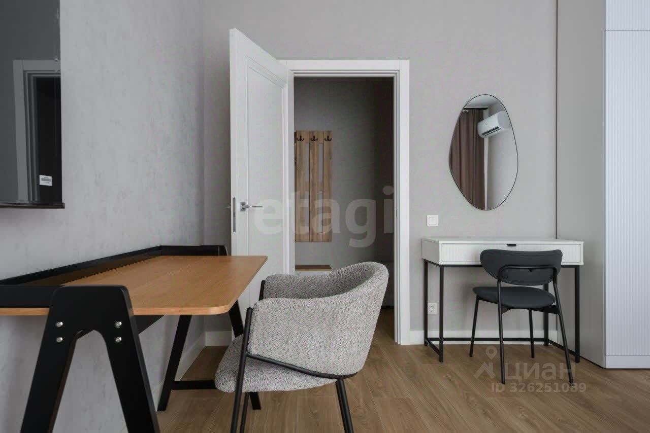 Интерьер выполнен в светлых тонах в стиле современной классики. В просторной кухне-гостиной установлены кухонный гарнитур, обеденная группа и комфортный диван с мягкой обивкой. В отдельной спальне размещены кровать, прикроватные тумбы, рабочий стол и комод с зеркалом. Вся техника также предусмотрена в квартире: духовка, посудомоечная и стиральная машины, холодильник, телевизор. Система хранения в отдельной гардеробной комнате.