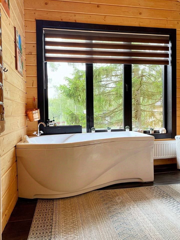 Дом оснащён всем необходимым для постоянного проживания-бытовая техника, wi-fi, газовое отопление. В 4 спальнях двуспальные кровати, прикроватные тумбочки, комоды и стеллажи для хранения вещей. В детской комнате - двухъярусная и раскладная кровати. Из 2-х спален на втором этаже выход на балкон, из спальни на первом этаже выход на террасу. Ванная комната на втором этаже с большими панорамными окнами, огромным зеркалом и видом на ели.