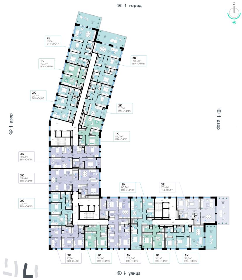 Архитектуру корпусов квартала разработало итальянское бюро. В облике отражена природная палитра: фасады выполнены в тёплой гамме и отличаются геометричной сеткой объёмных элементов светло-бежевого оттенка. За ними скрываются вставки с текстурой под дерево, создающие игру света и тени. Из окон открываются виды на парк и реку, а всего в трёх минутах пешком — набережная. В14 примыкает к главному парку СберСити. В квартале — уютные дворы без машин с крупномерными растениями, кустарниками, многолетними цветами, детскими площадками и зонами отдыха.