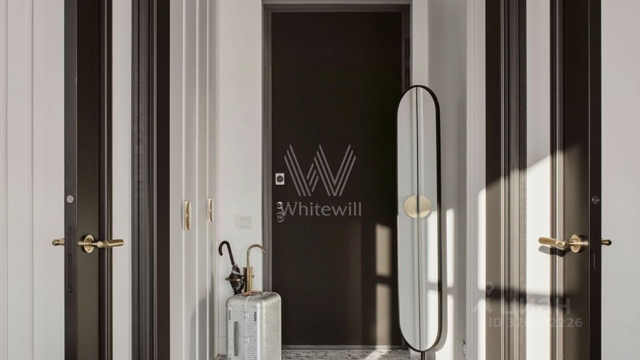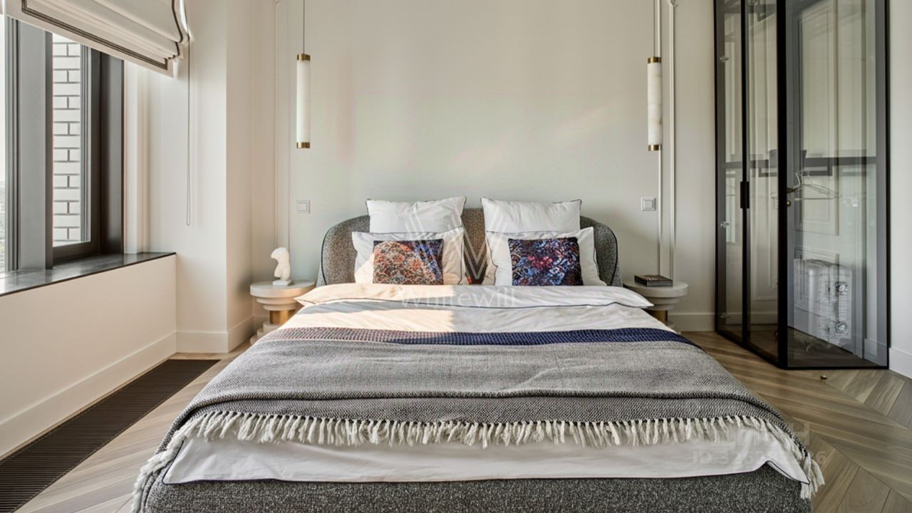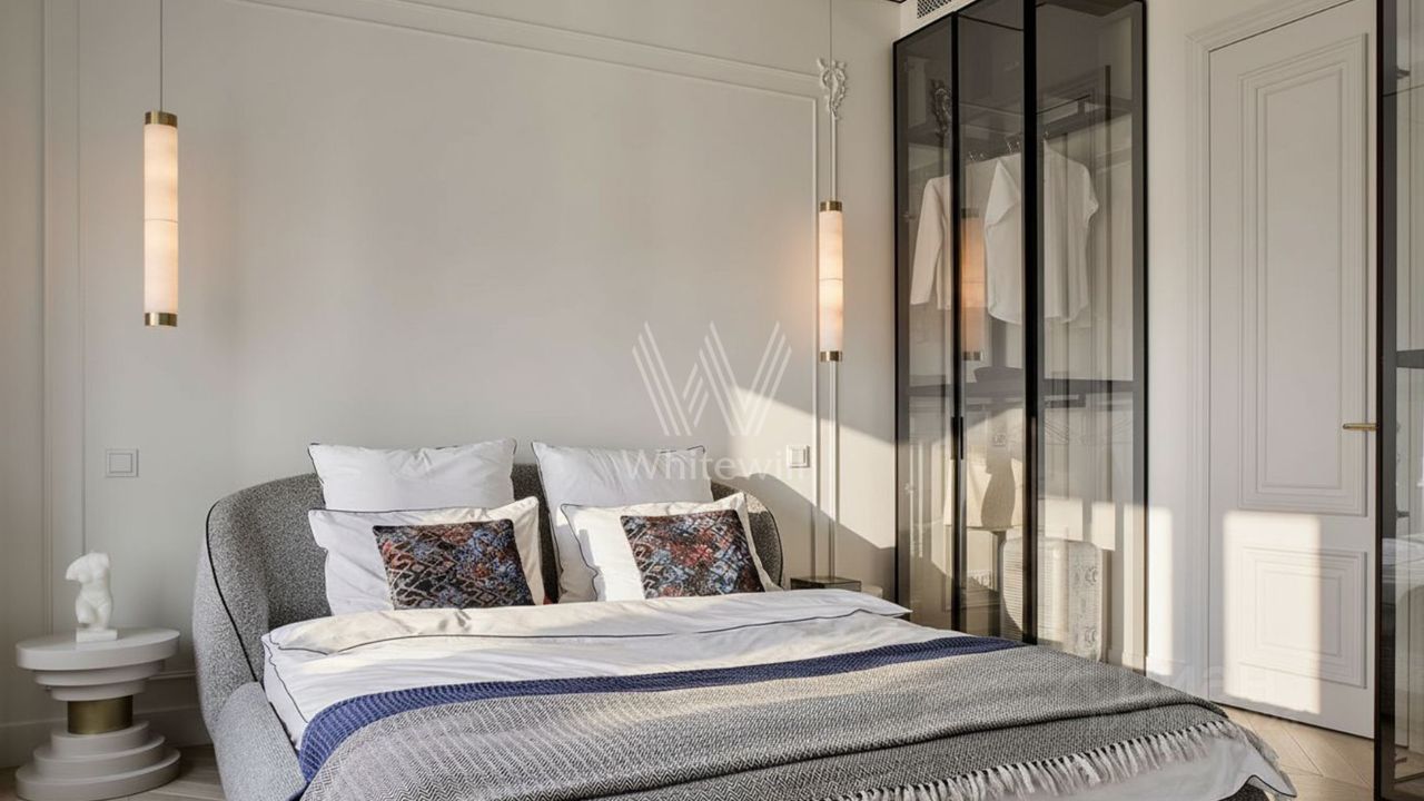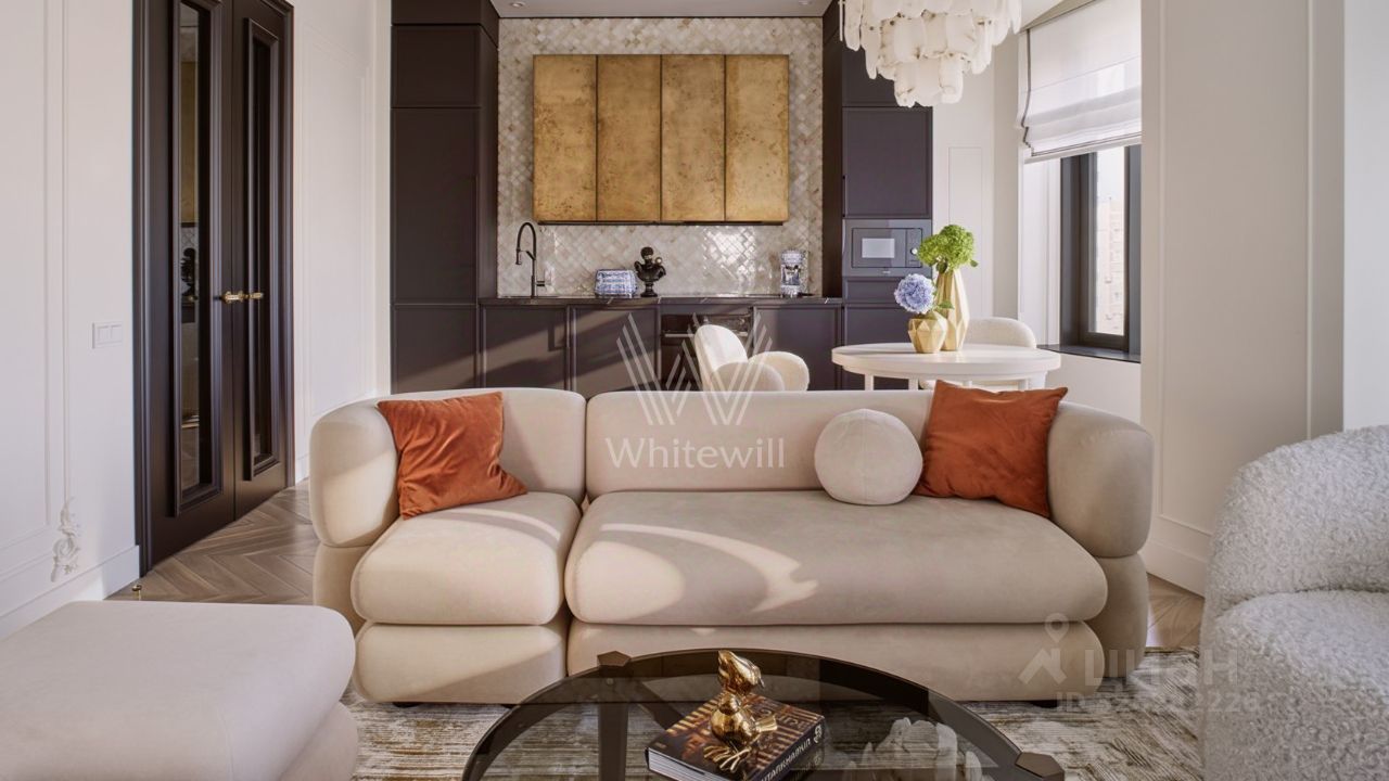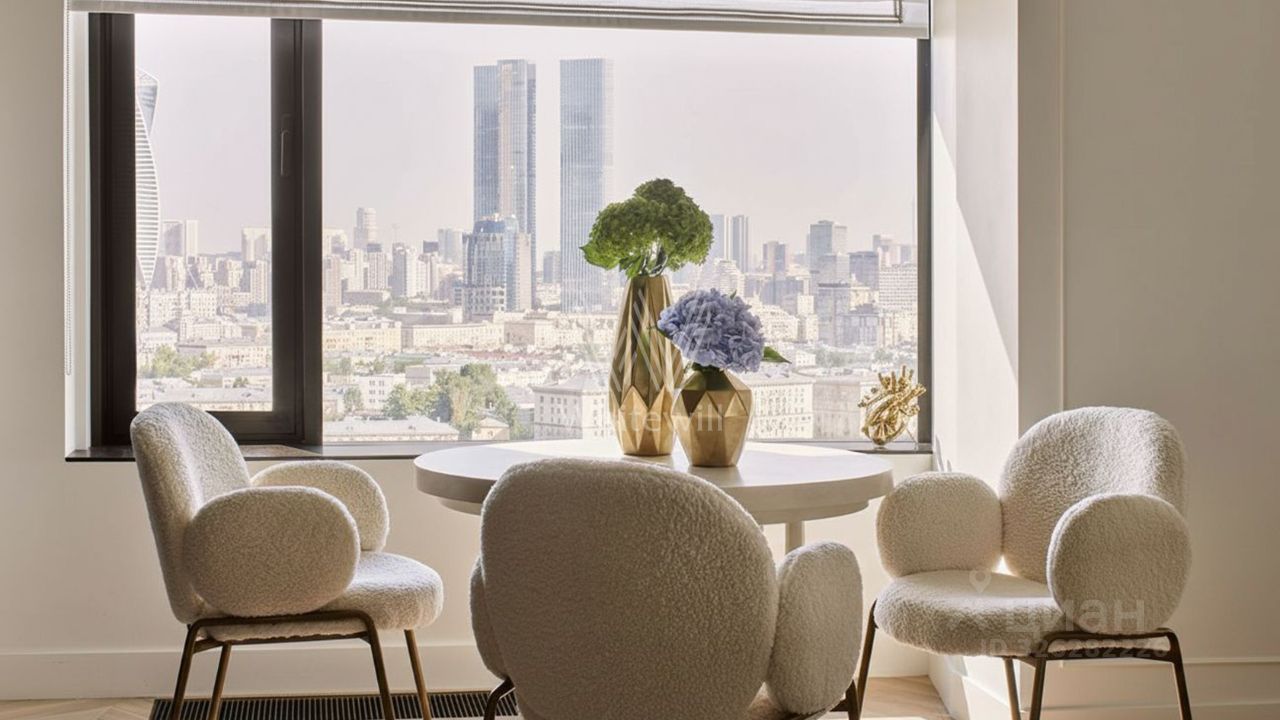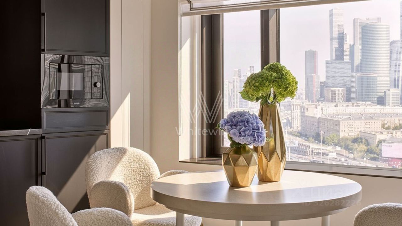 Функциональная планировка включает просторную кухню-гостиную с обеденной зоной и лаунжем, мастер-спальню с собственной ванной, детскую спальню, гостевой санузел и холл со встроенными шкафами для одежды. Благодаря панорамному остеклению пространство наполнено светом и теплом, открываются виды на город и деловой центр ''Москва-Сити''.