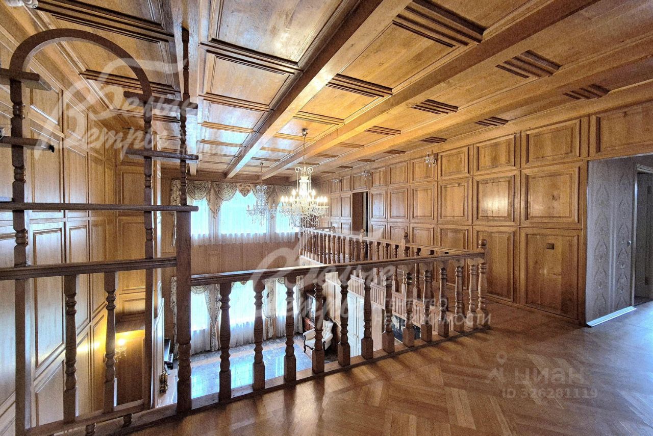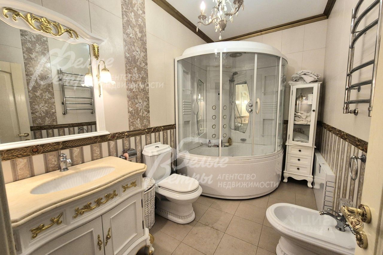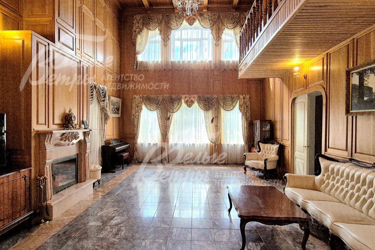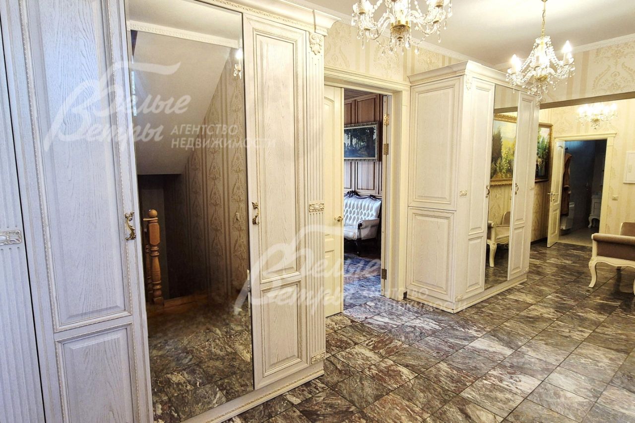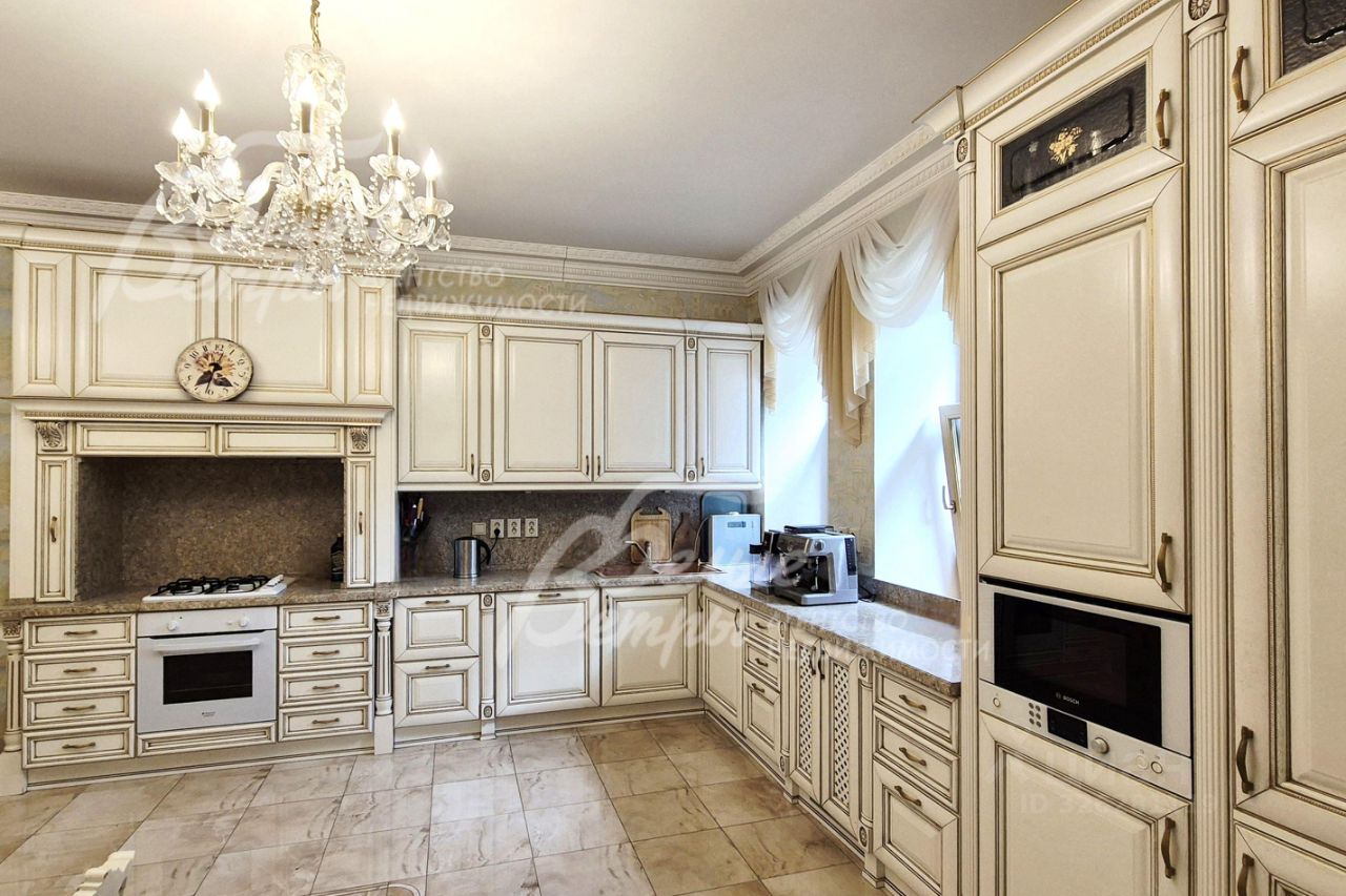 Мебель, оборудование: кухонный гарнитур в классическом стиле со шпонированными фасадами и столешницей из камня (Италия). Встроенная техника: газовая варочная панель, духовой шкаф, микроволновая печь Bosch, посудомоечная машина, двухкамерный холодильник. Телевизоры Philips, Bosch, стиральные машины Samsung и Bosch, сушильная машина Siemens. В гостиной антикварная мебель, в зоне столовой обеденная группа из массива на 8 персон. В спальнях дорогие гарнитуры из массива дерева с резными элементами (двуспальные кровати, прикроватные тумбы, комоды, туалетные столики, банкетки, вместительные шкафные группы). В кабинете кожаный диван, солидный рабочий стол и шкаф для документов из массива. В гардеробных функциональная система хранения. Во всех помещениях дорогие карнизы, шторы с подхватами и ламбрекенами, изящные тюли, оригинальные люстры и светильники. Второй свет украшают хрустальные люстры с имитацией свечей, на стенах разнообразные картины в общей стилистике дома..