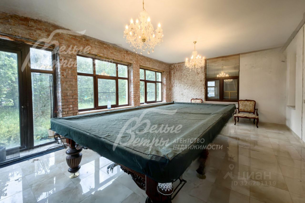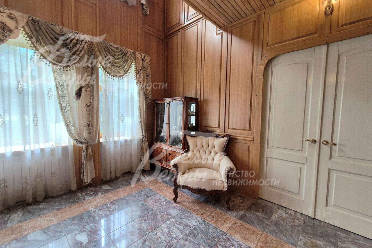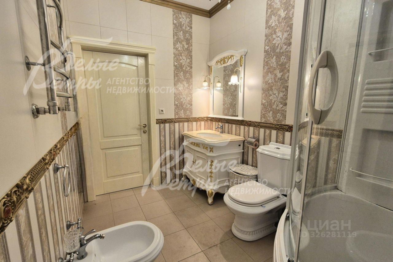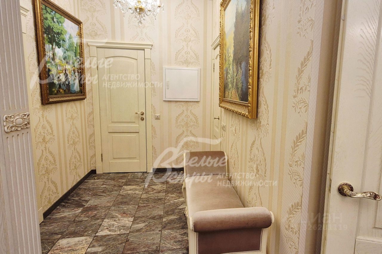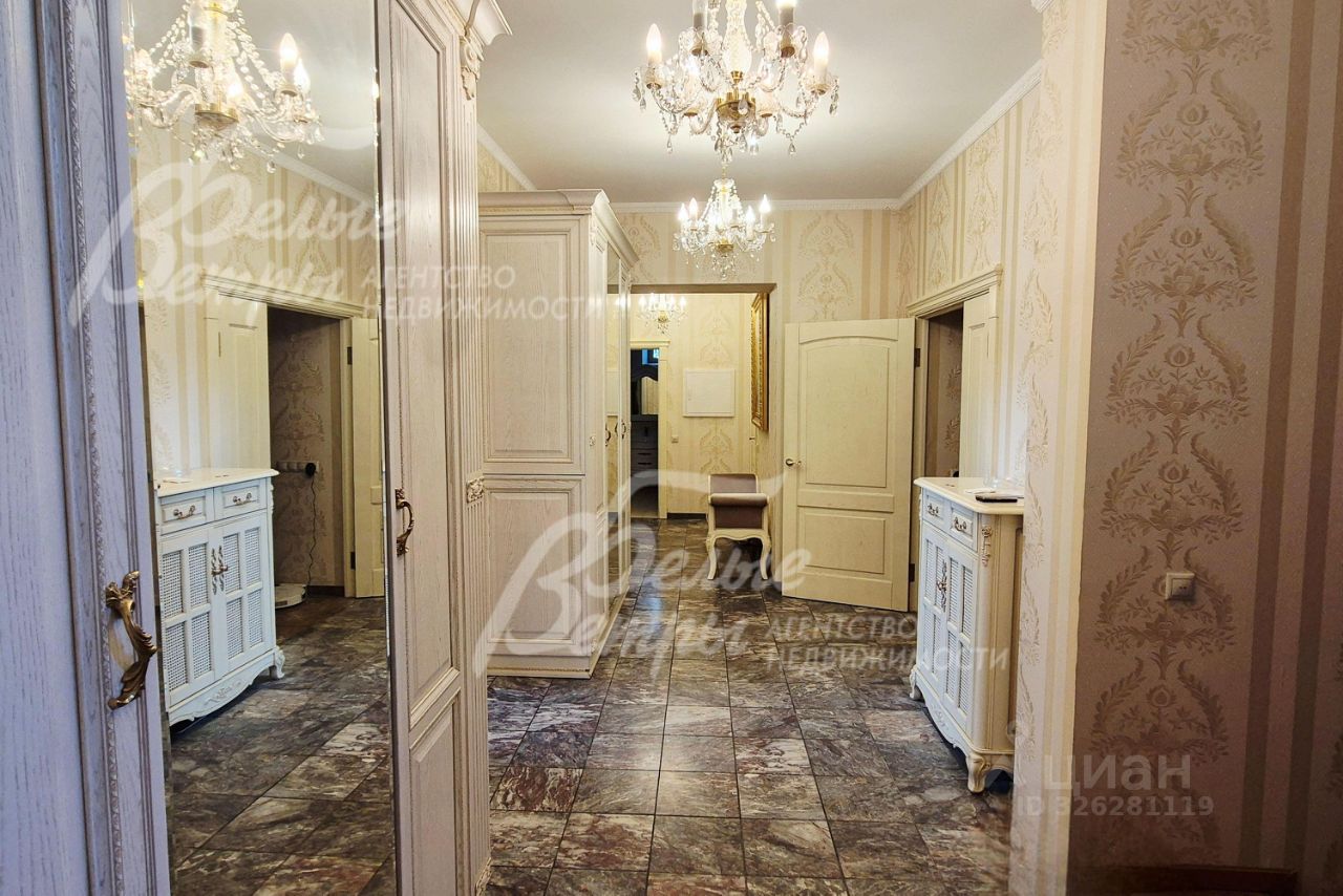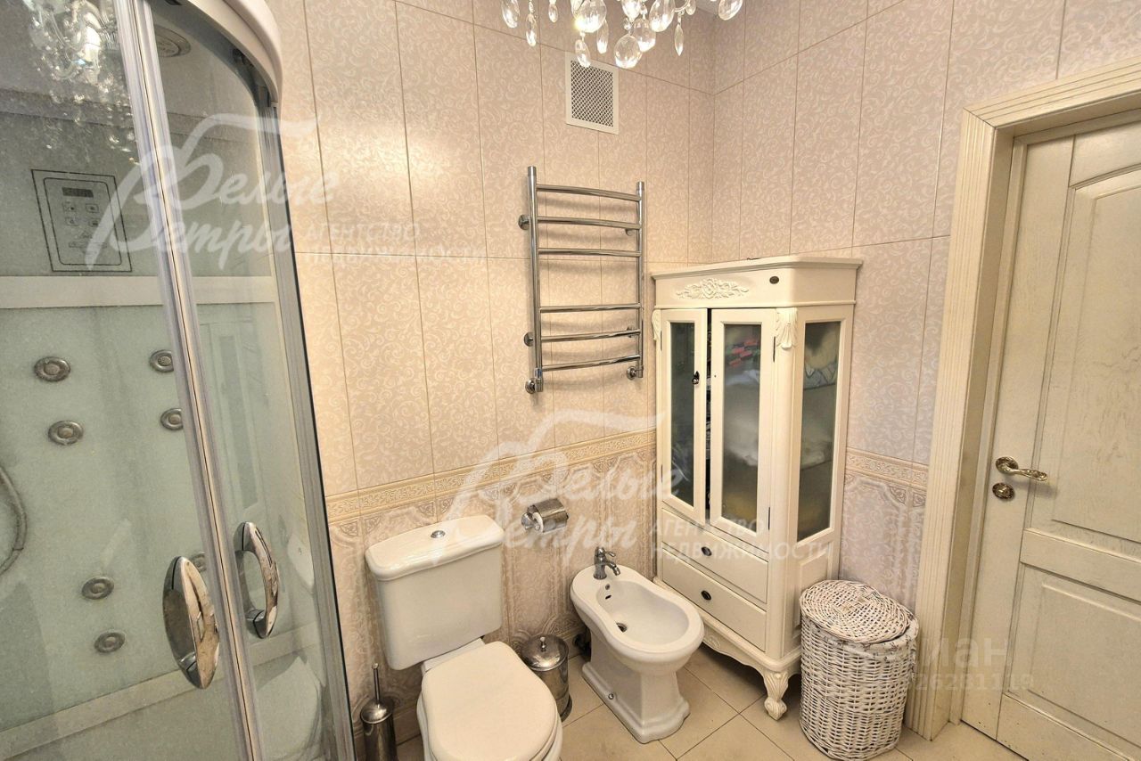 Мебель, оборудование: кухонный гарнитур в классическом стиле со шпонированными фасадами и столешницей из камня (Италия). Встроенная техника: газовая варочная панель, духовой шкаф, микроволновая печь Bosch, посудомоечная машина, двухкамерный холодильник. Телевизоры Philips, Bosch, стиральные машины Samsung и Bosch, сушильная машина Siemens. В гостиной антикварная мебель, в зоне столовой обеденная группа из массива на 8 персон. В спальнях дорогие гарнитуры из массива дерева с резными элементами (двуспальные кровати, прикроватные тумбы, комоды, туалетные столики, банкетки, вместительные шкафные группы). В кабинете кожаный диван, солидный рабочий стол и шкаф для документов из массива. В гардеробных функциональная система хранения. Во всех помещениях дорогие карнизы, шторы с подхватами и ламбрекенами, изящные тюли, оригинальные люстры и светильники. Второй свет украшают хрустальные люстры с имитацией свечей, на стенах разнообразные картины в общей стилистике дома..