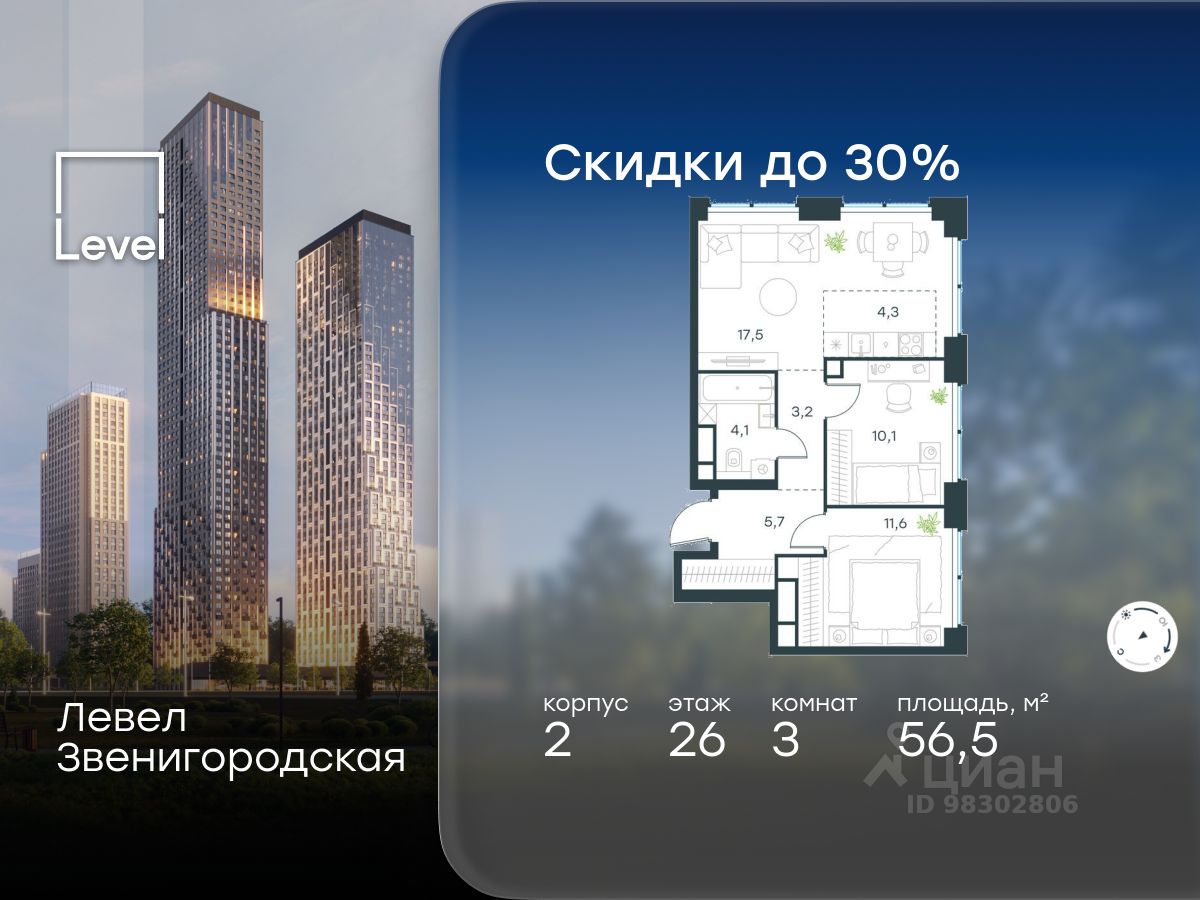 В жилом квартале продаётся 3-комнатная квартира площадью 56.50 кв.м без отделки. Квартира расположена на 26 этаже 64 этажного корпуса 2 в жилом комплексе комфорт класса Левел Звенигородская (компания Level Group/Левел групп).