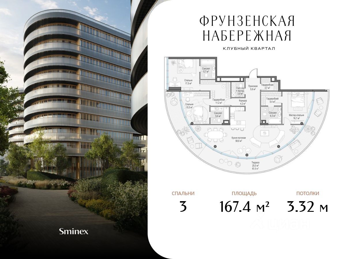 Просторная квартира с тремя мастер-спальнями. Панорамные окна наполнят квартиру светом, а уникальной её особенностью станет огромный полукруглый балкон.