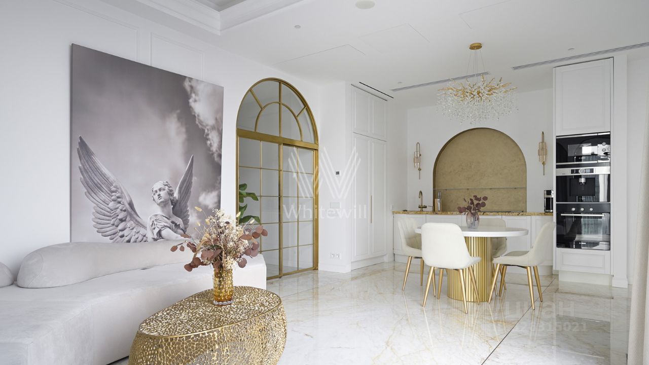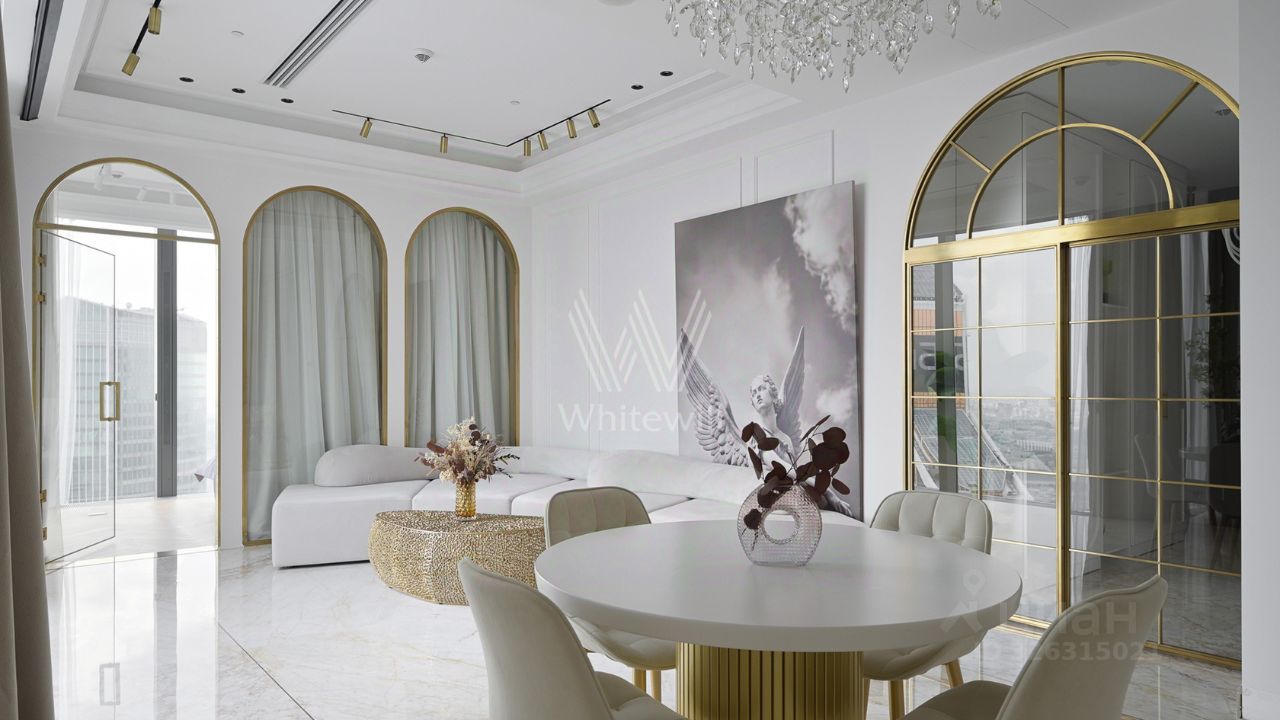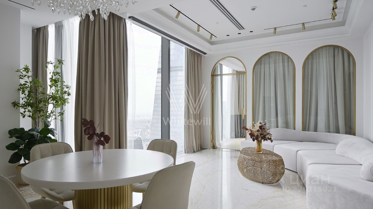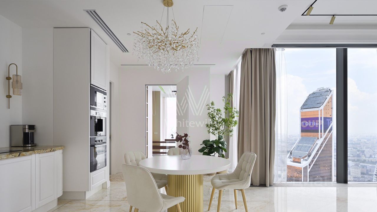 Эти апартаменты словно сотканы из света, камня и музыки. Парижские салоны перекочевали на высоту 250 метров над Москвой, превратив гостиную этой квартиры в зал для светских приемов с изящными золотыми арками на высоте неба.