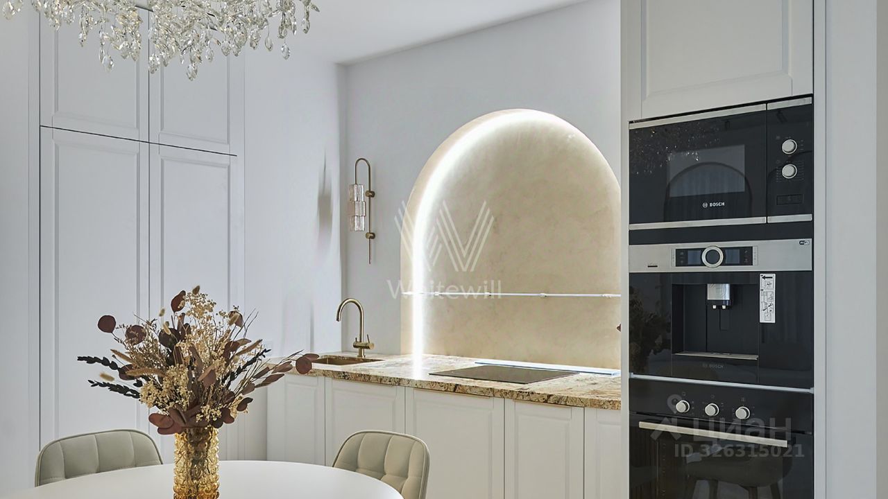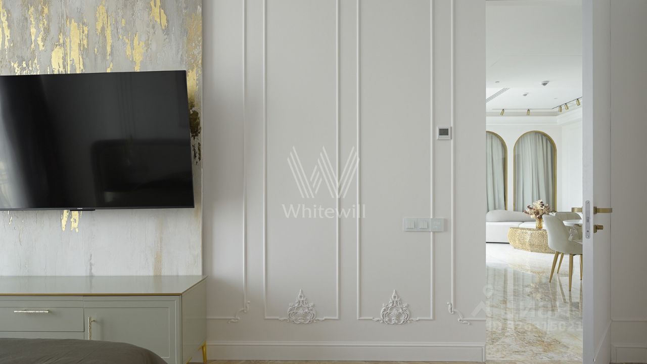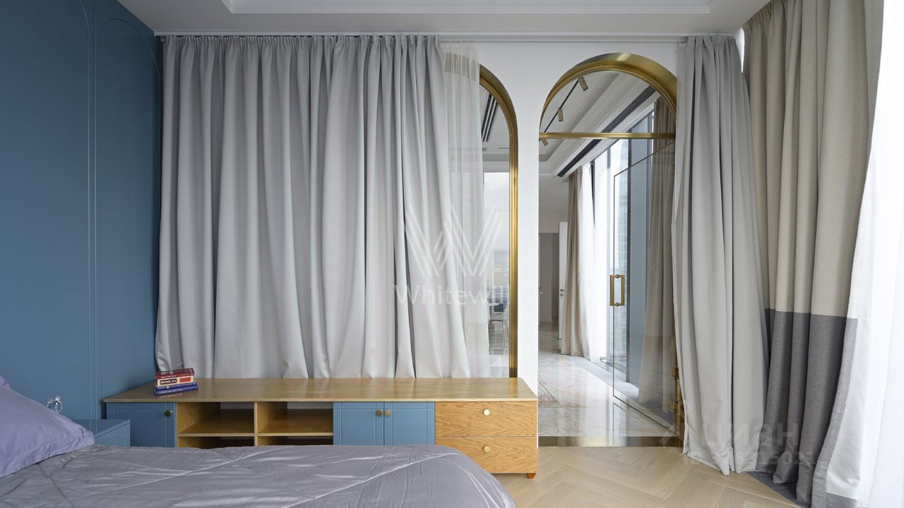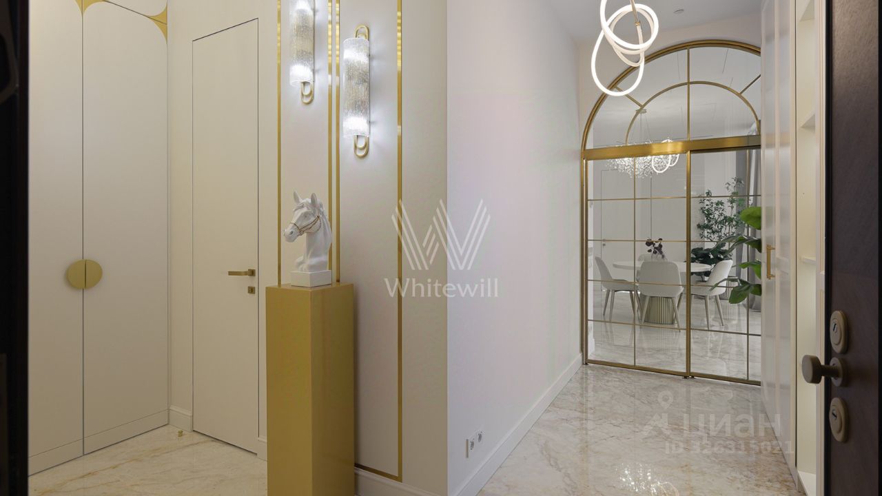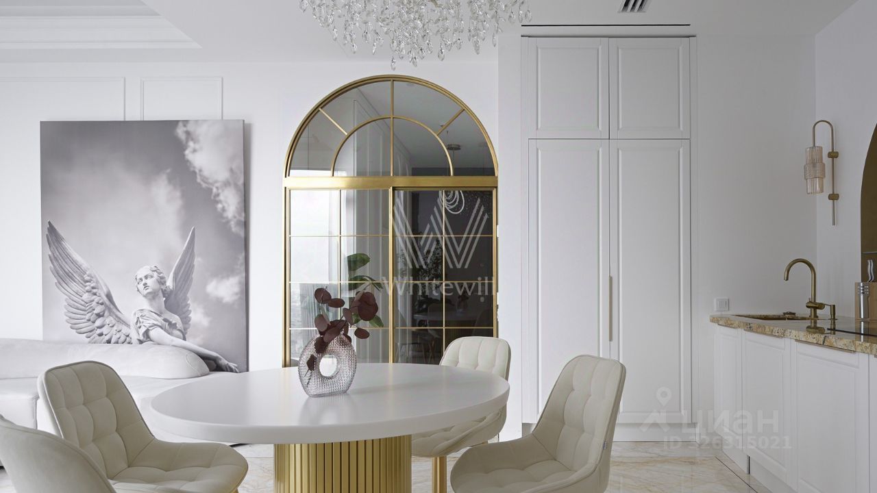 Эти апартаменты словно сотканы из света, камня и музыки. Парижские салоны перекочевали на высоту 250 метров над Москвой, превратив гостиную этой квартиры в зал для светских приемов с изящными золотыми арками на высоте неба.