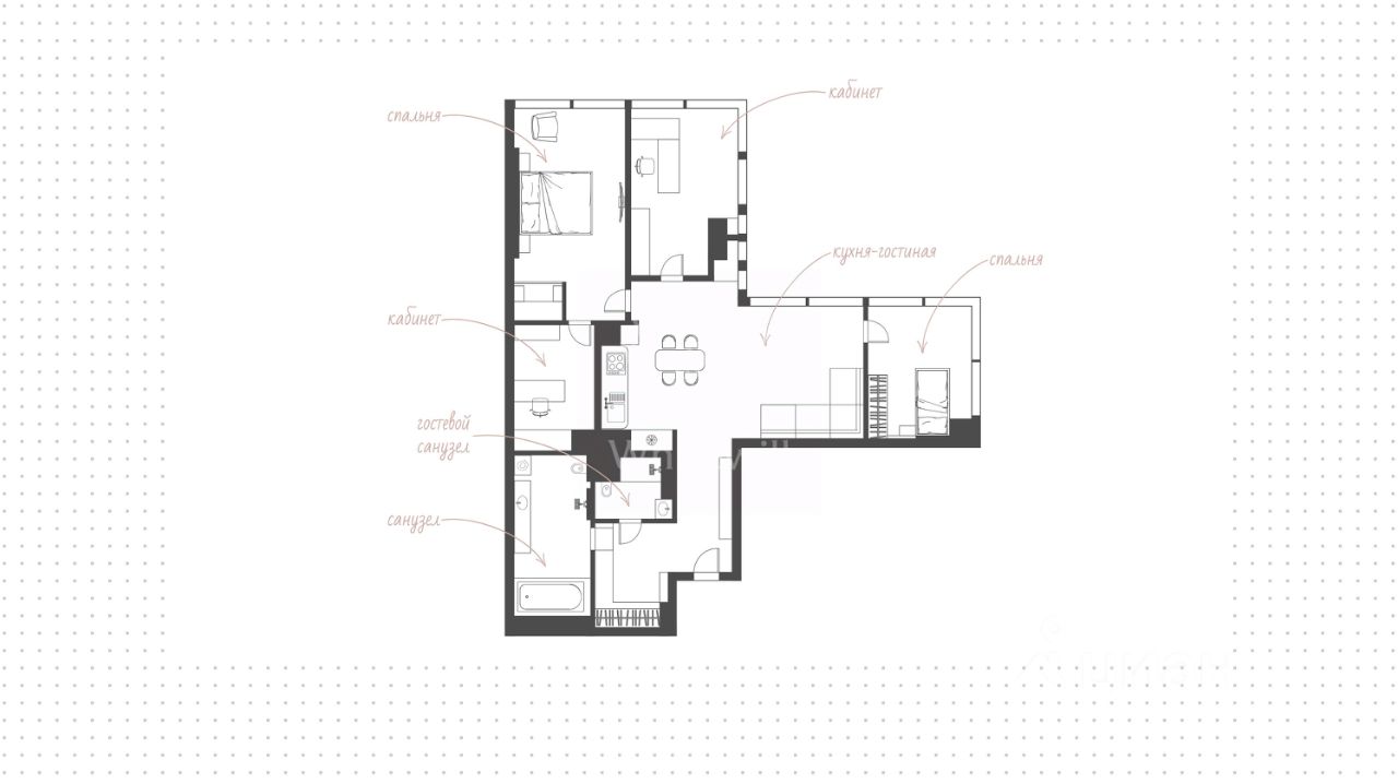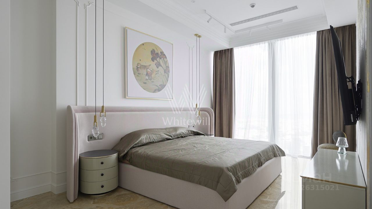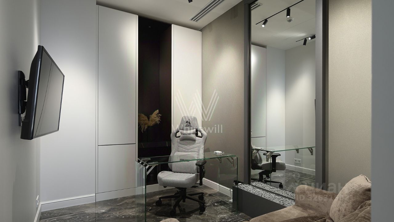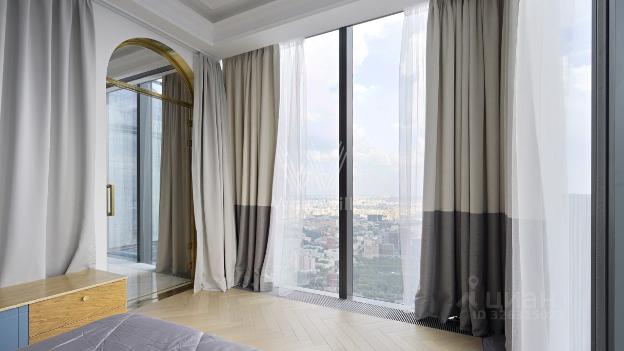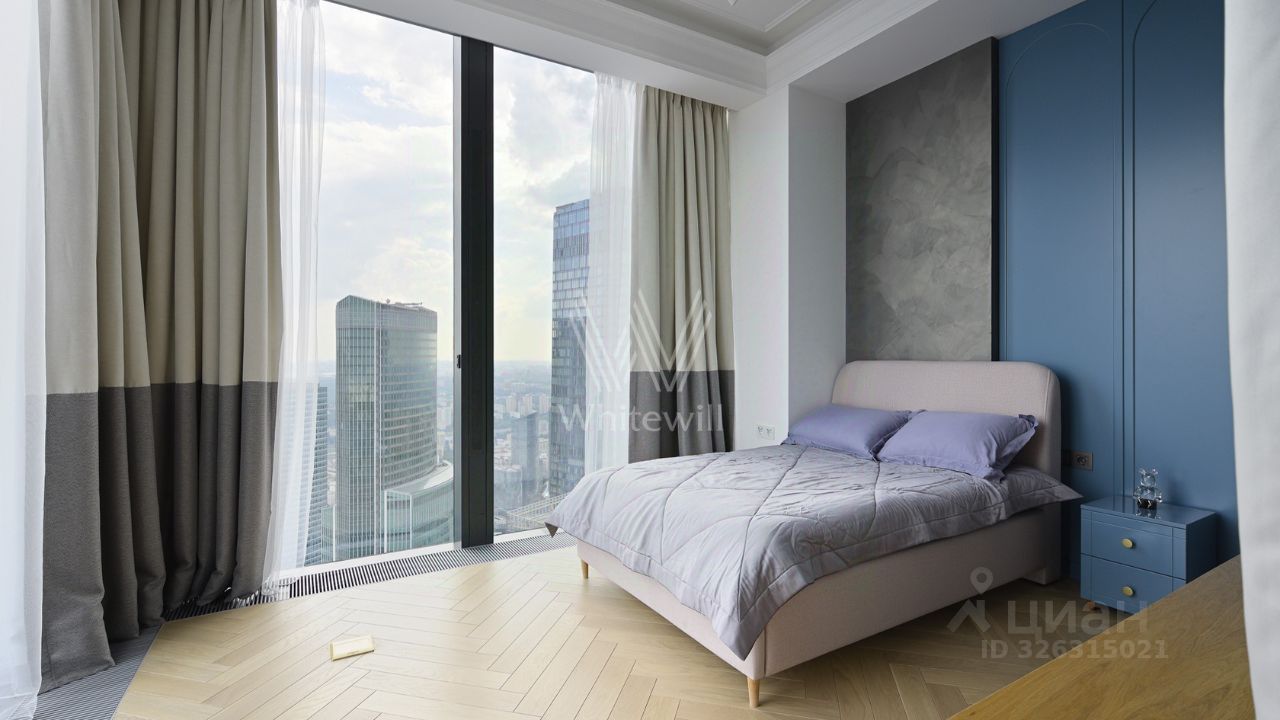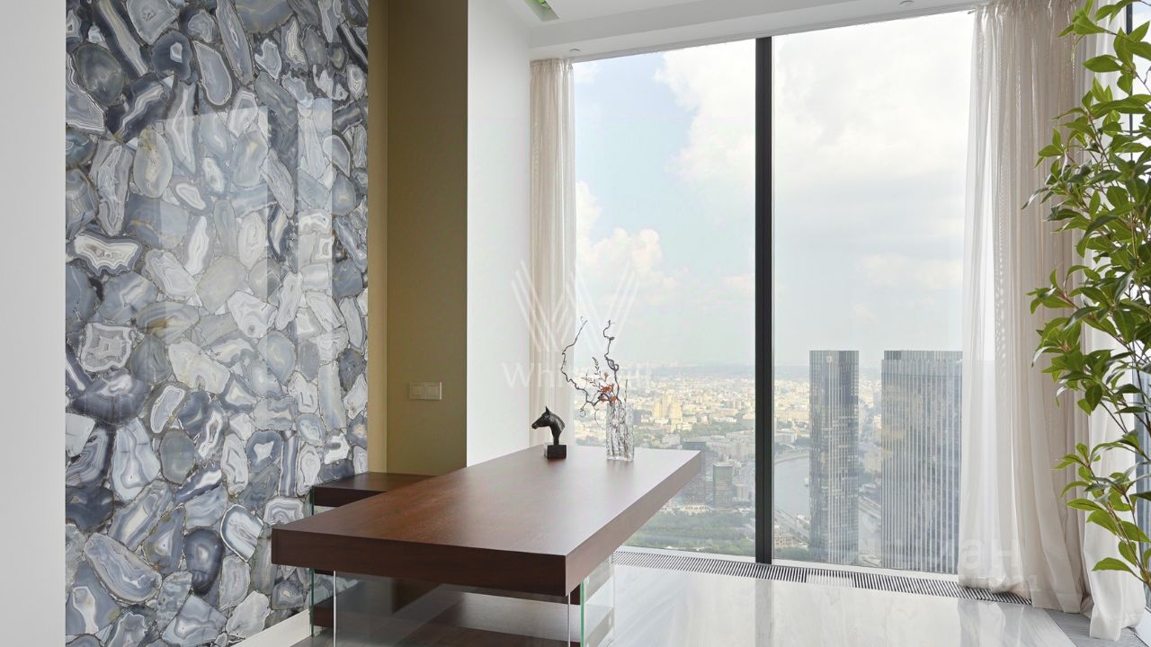 Главное об апартаментах: 69 этаж, 135 метров. Гостиная, две видовые спальни, отдельный кабинет. Премиальная отделка из натурального камня и дерева. Виды на Дом Правительства, Лужники, сталинские высотки и Останкинскую башню.