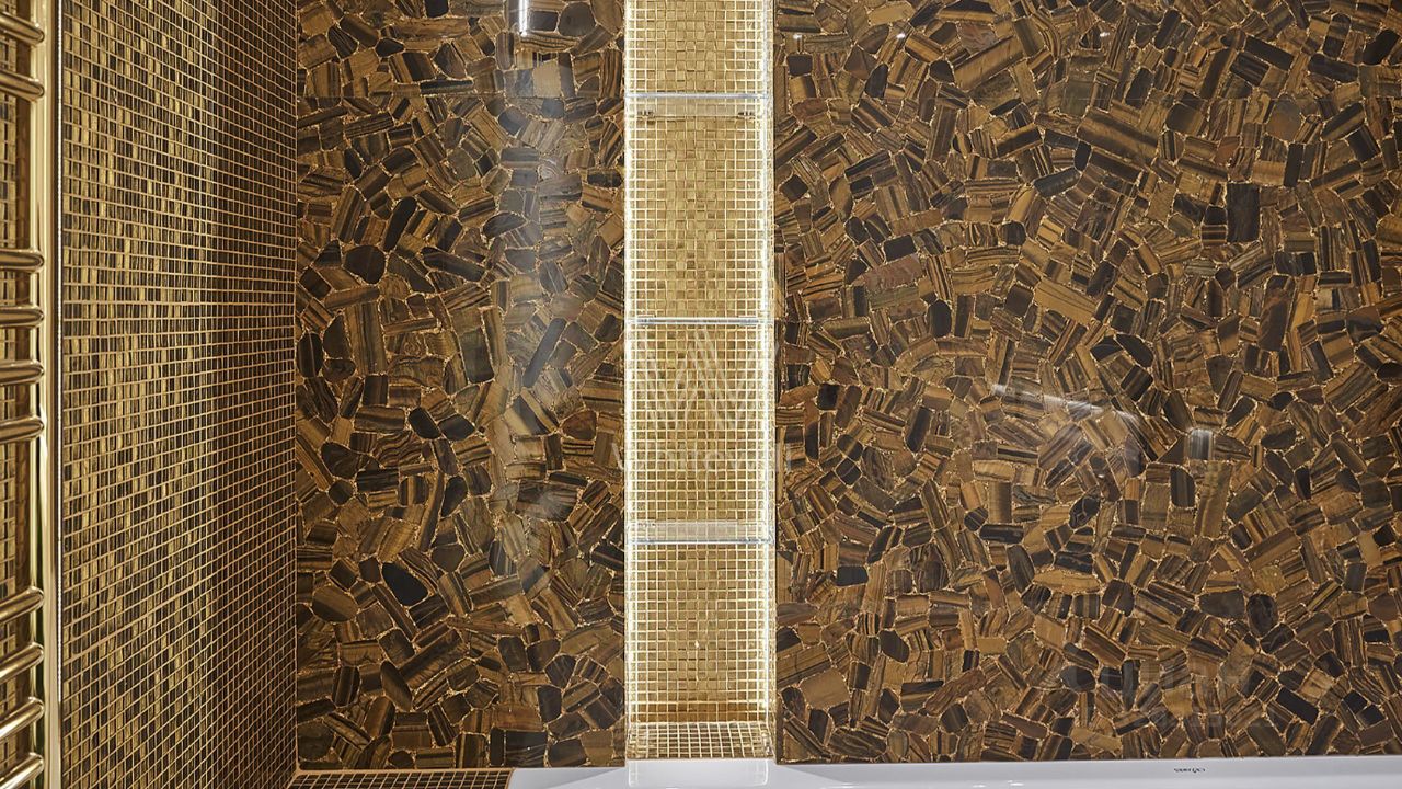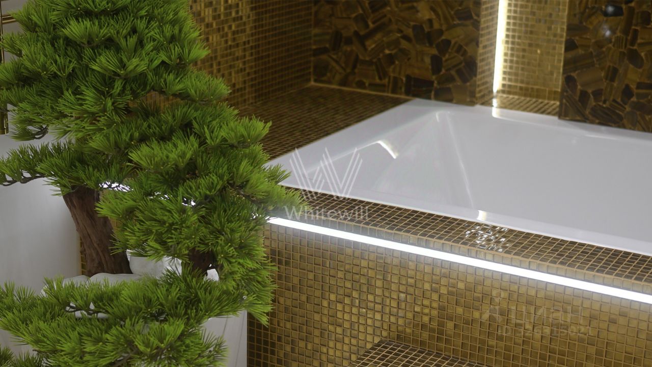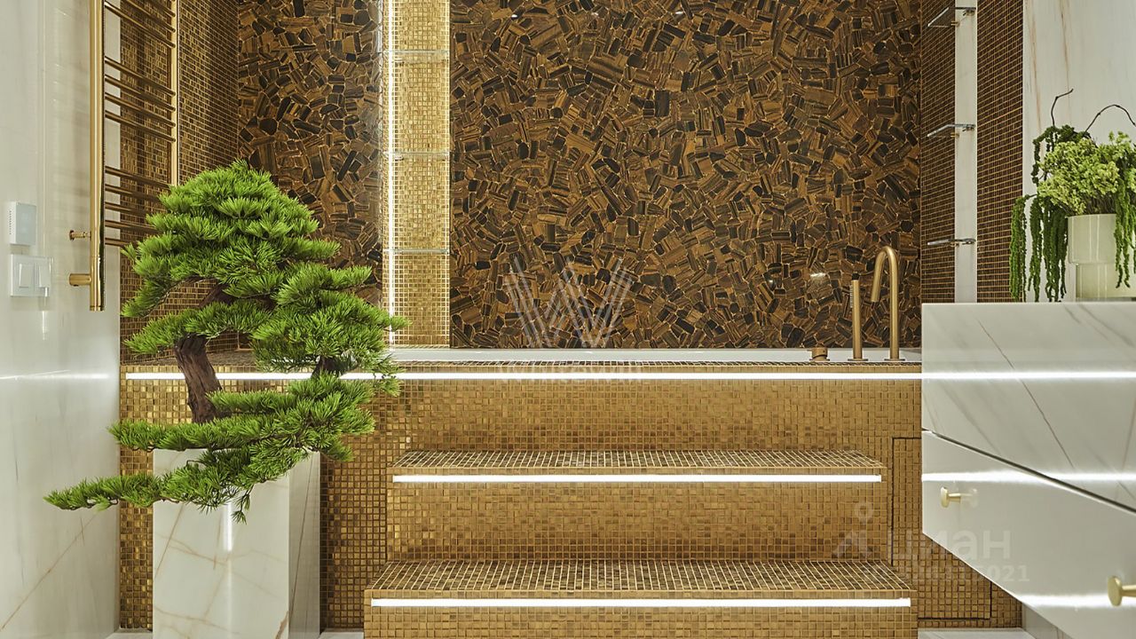 В закатном солнце в панорамное окно спальни заглядывают Лужники, Дом Правительства, сталинские высотки и уходящие за горизонт московские набережные, превращаясь в личную коллекцию видов, доступную только тебе. Ванна с зелёным бонсаем выглядит как личный спа-салон.