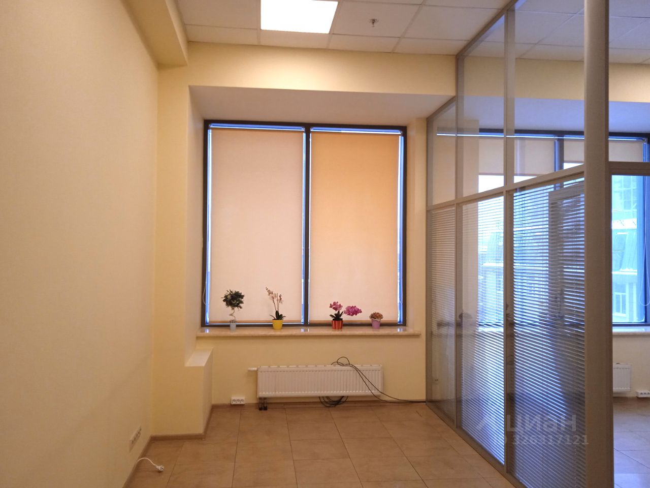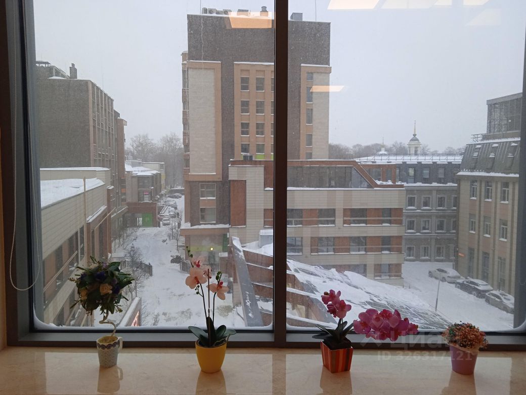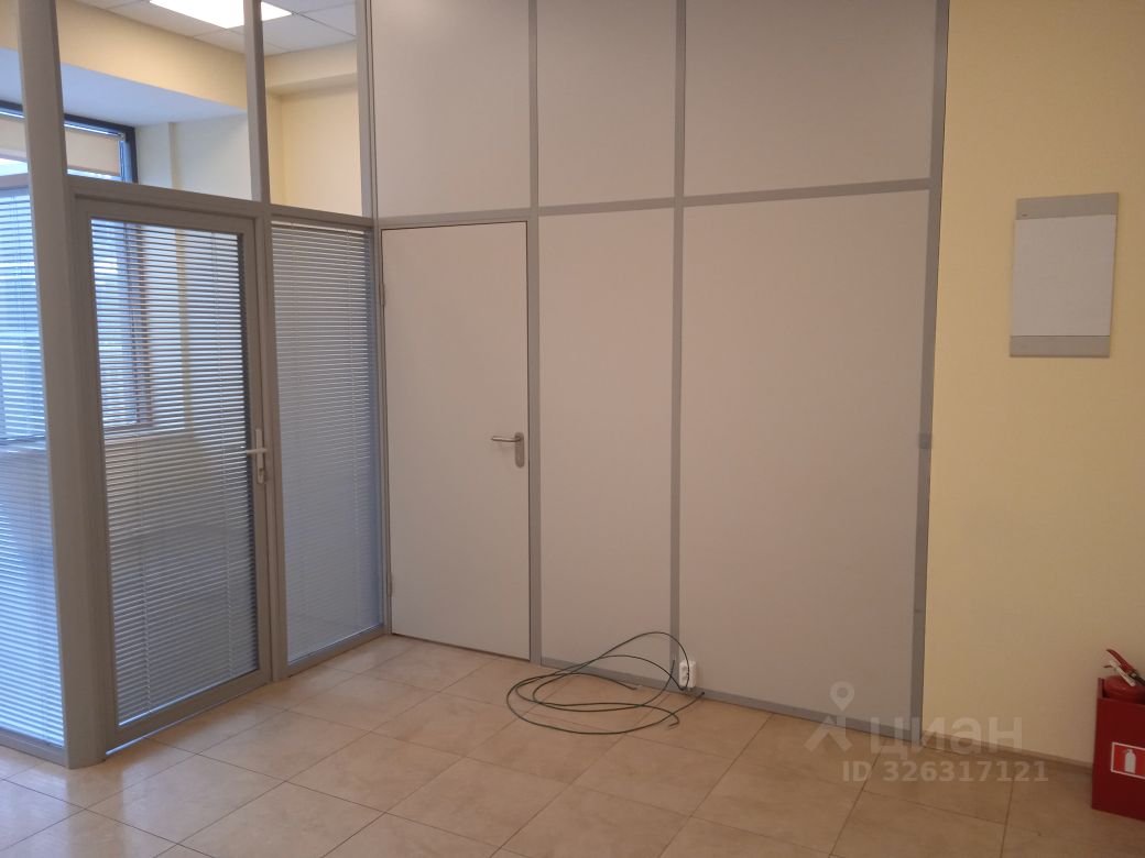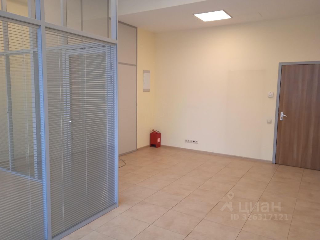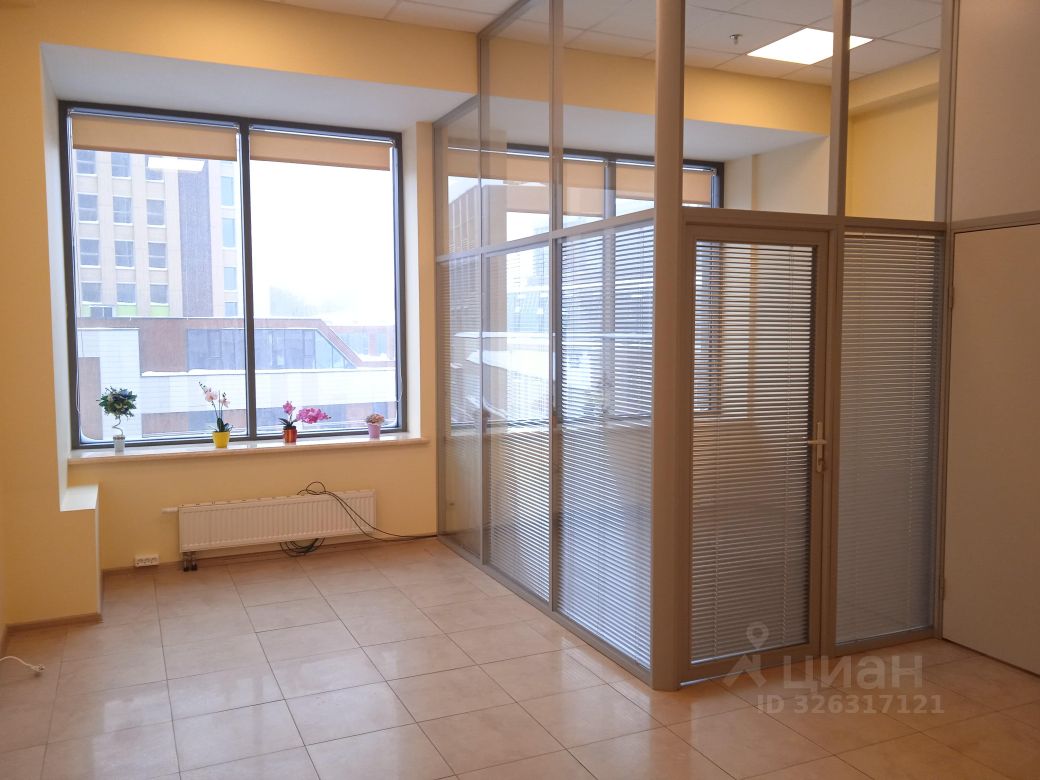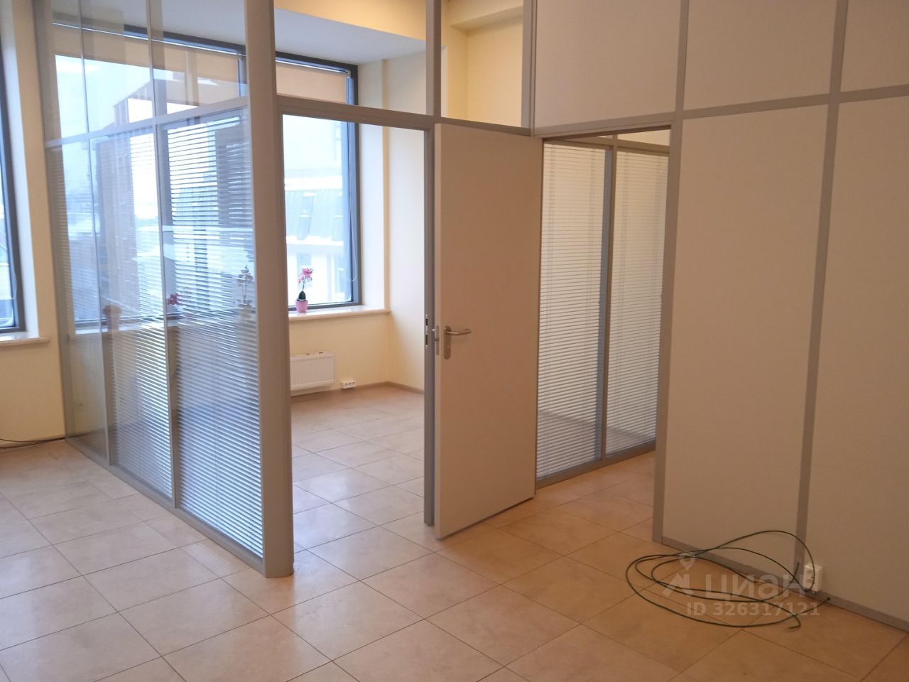 Площадь - 35 м². Четвёртый этаж 13-этажного офисного здания. Большие окна выходят на внутреннюю территорию. Установлены межкомнатные перегородки с дверями.