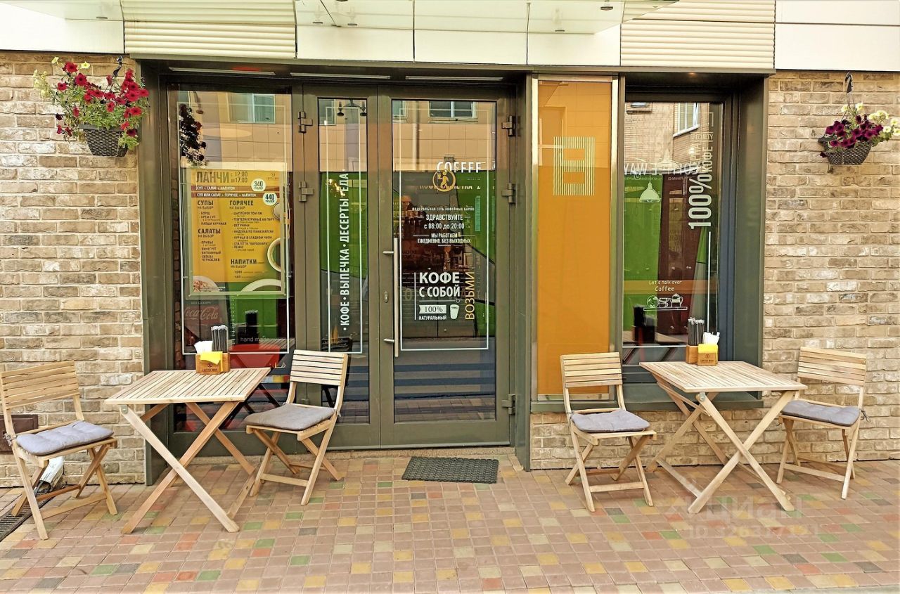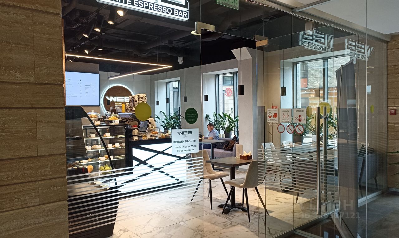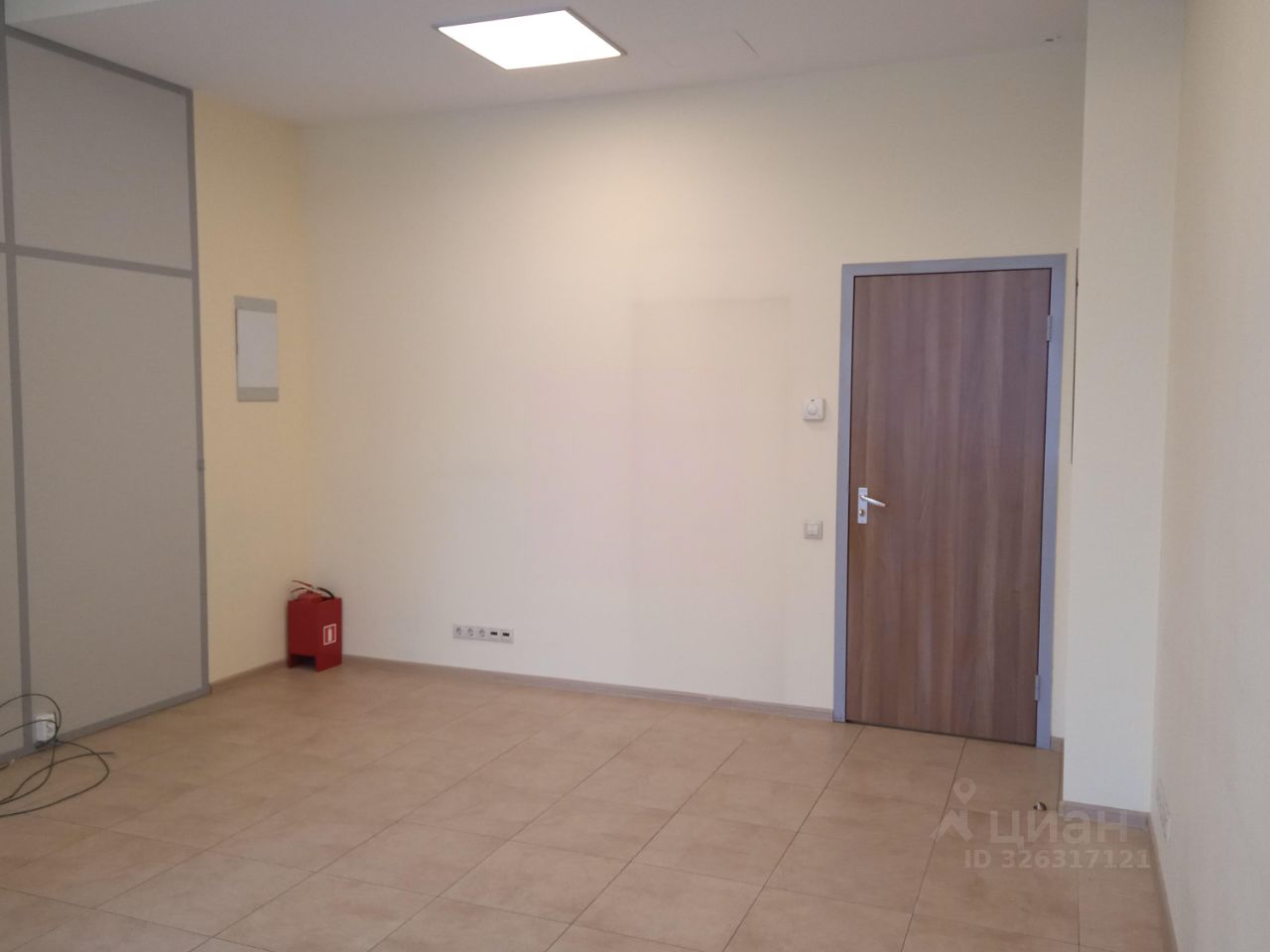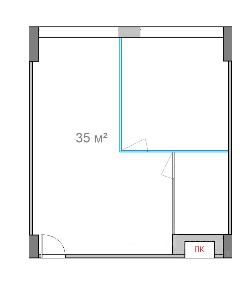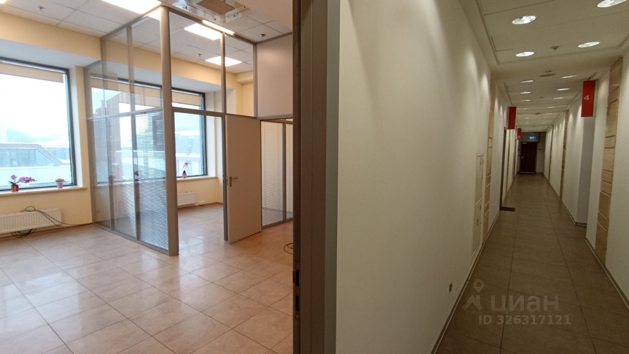 Площадь - 35 м². Четвёртый этаж 13-этажного офисного здания. Большие окна выходят на внутреннюю территорию. Установлены межкомнатные перегородки с дверями.