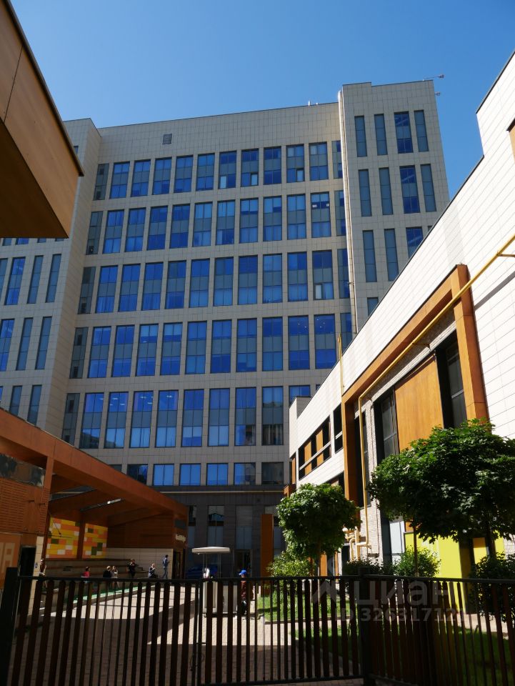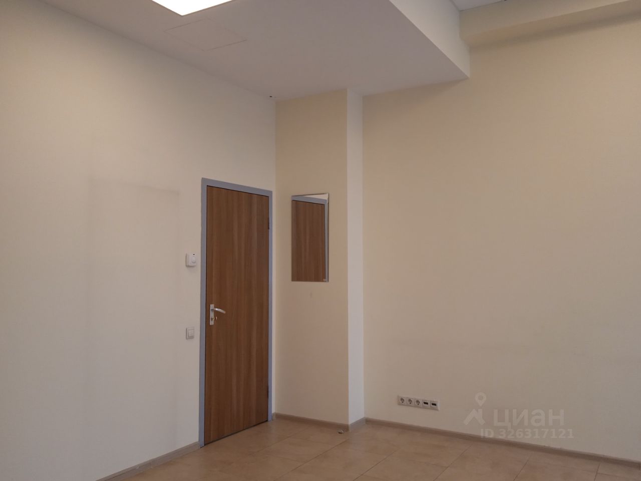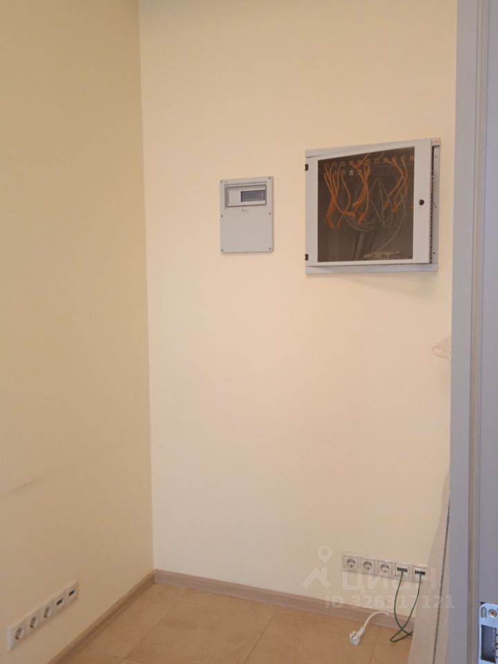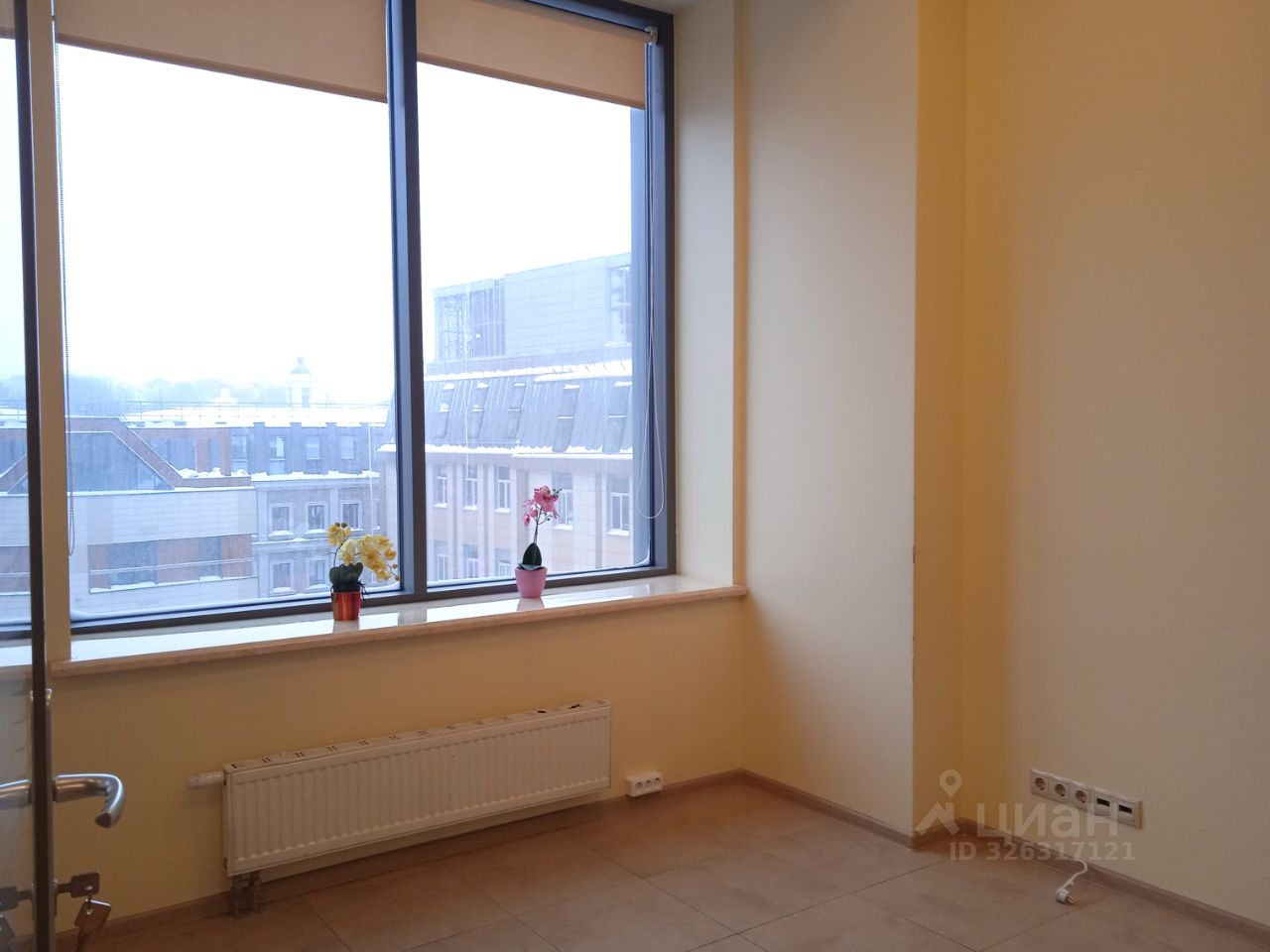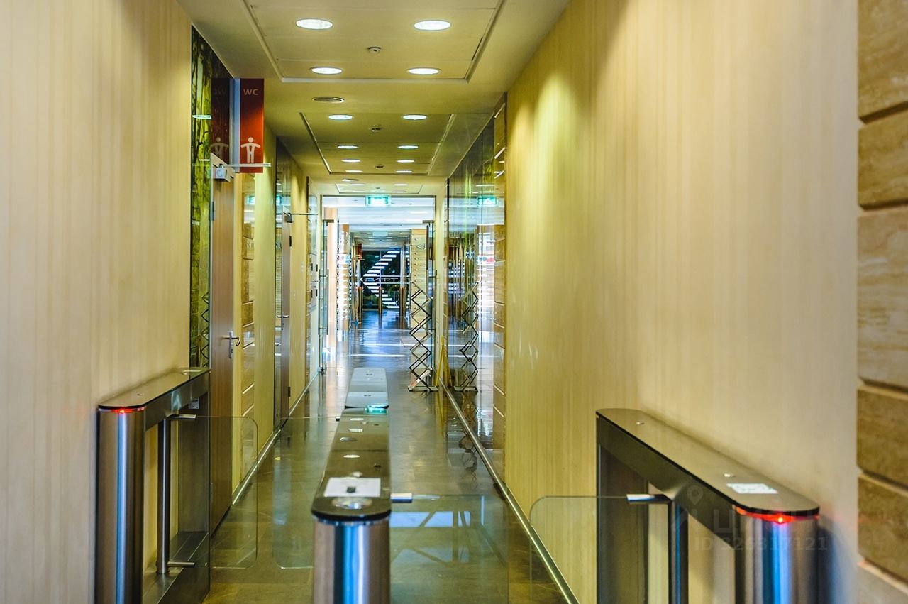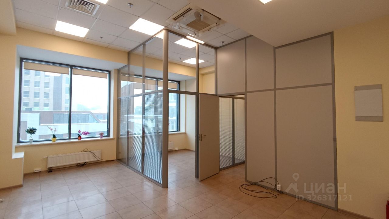 Площадь - 35 м². Четвёртый этаж 13-этажного офисного здания. Большие окна выходят на внутреннюю территорию. Установлены межкомнатные перегородки с дверями.