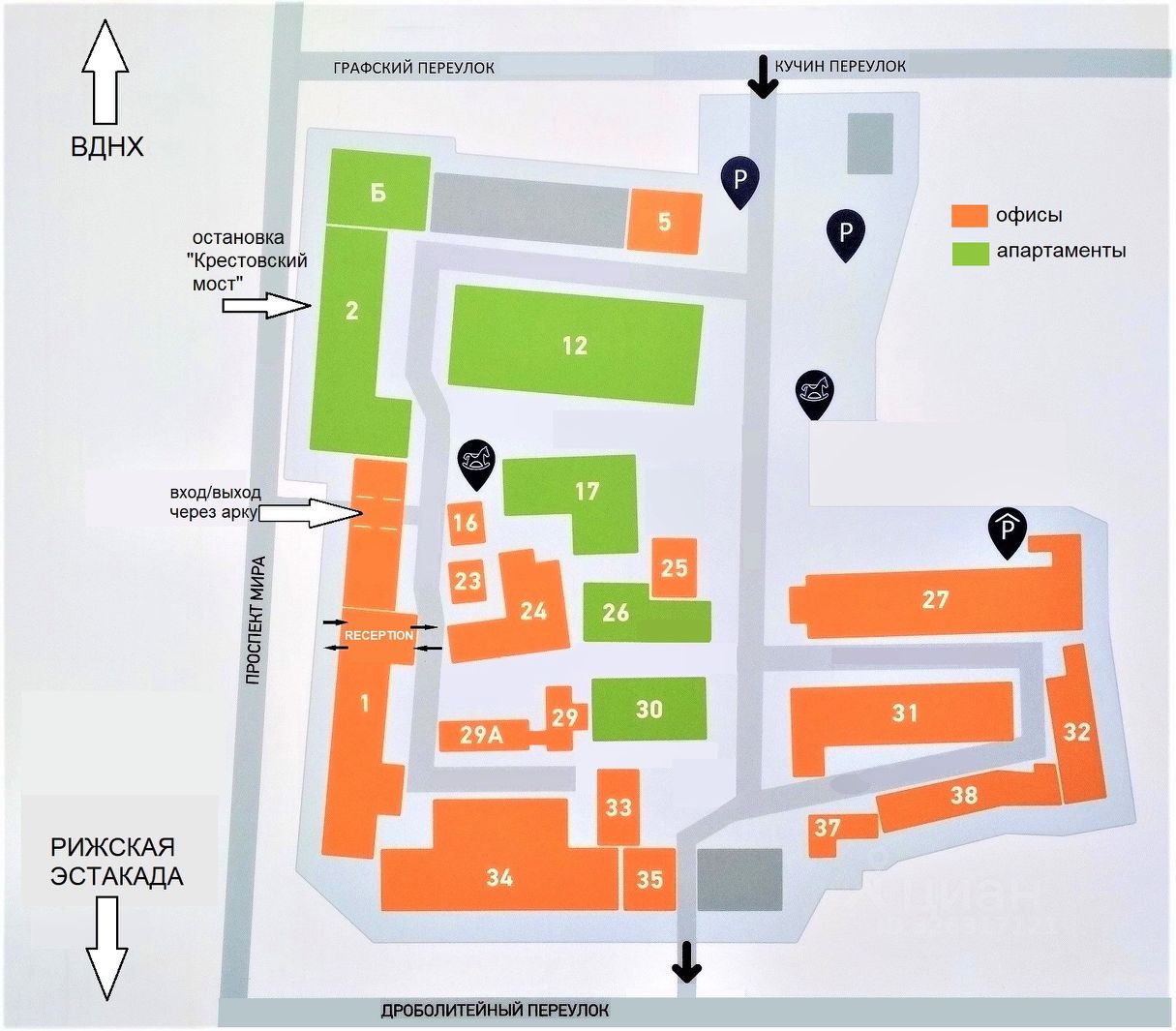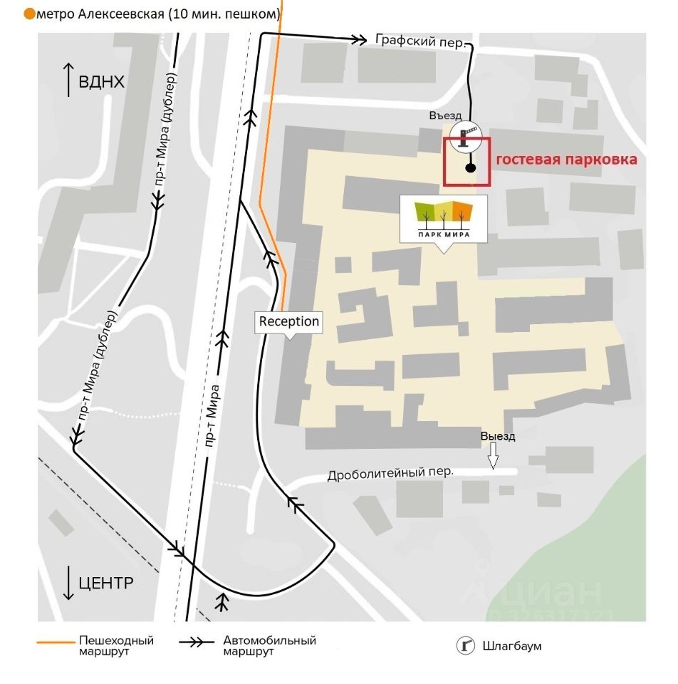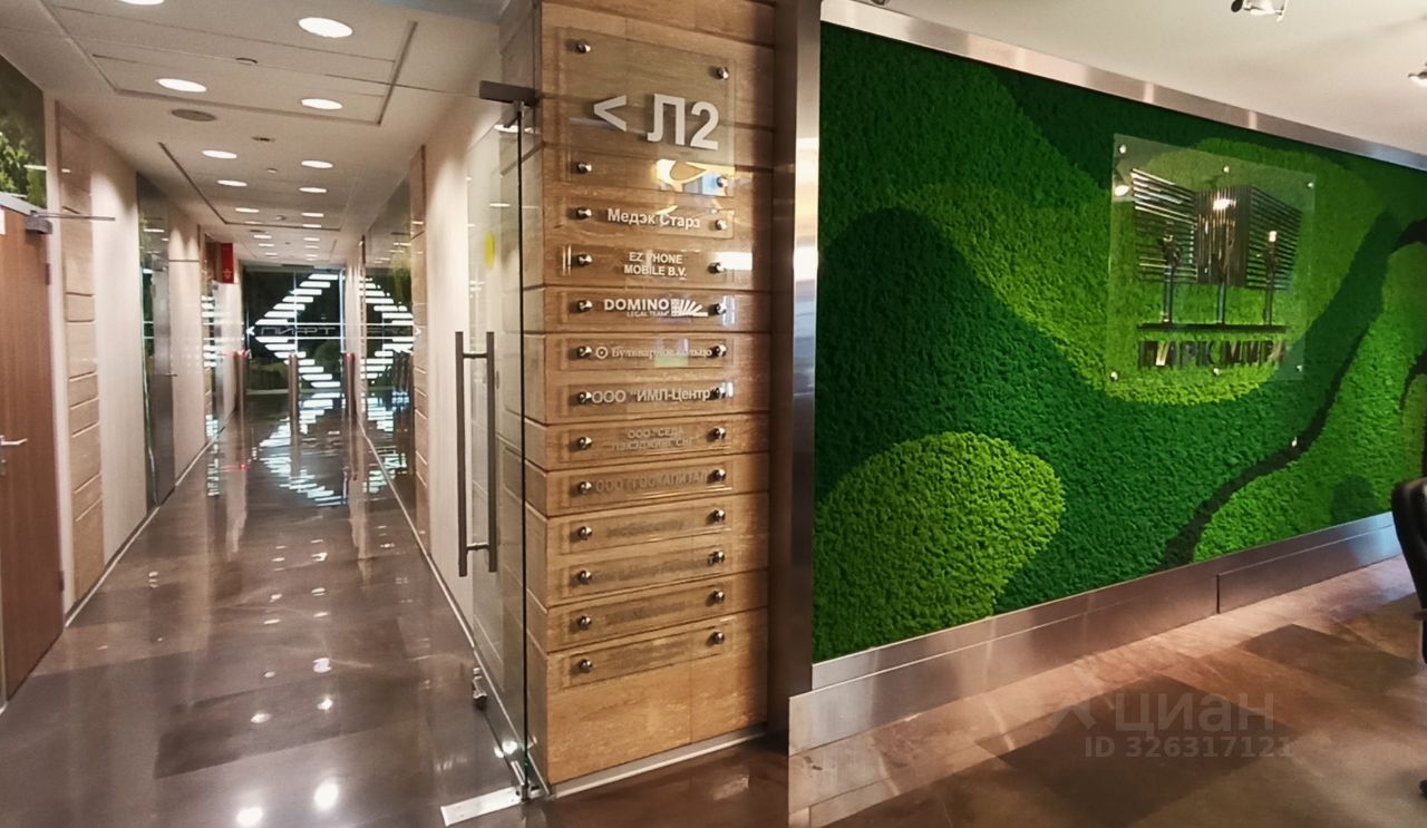 В здании 4 больших лифта, центральный ресепшн, лобби с кафе, пропускная система. Время работы 24/7. Внутри ''Парка Мира'' благоустроенная охраняемая территория, инфраструктура. Наземный и подземный платный паркинг. Удобная транспортная доступность: 10 минут пешком от станций метро Алексеевская и Рижская (БКЛ и D2), до Садового кольца 3 км, до ТТК - 1 км.