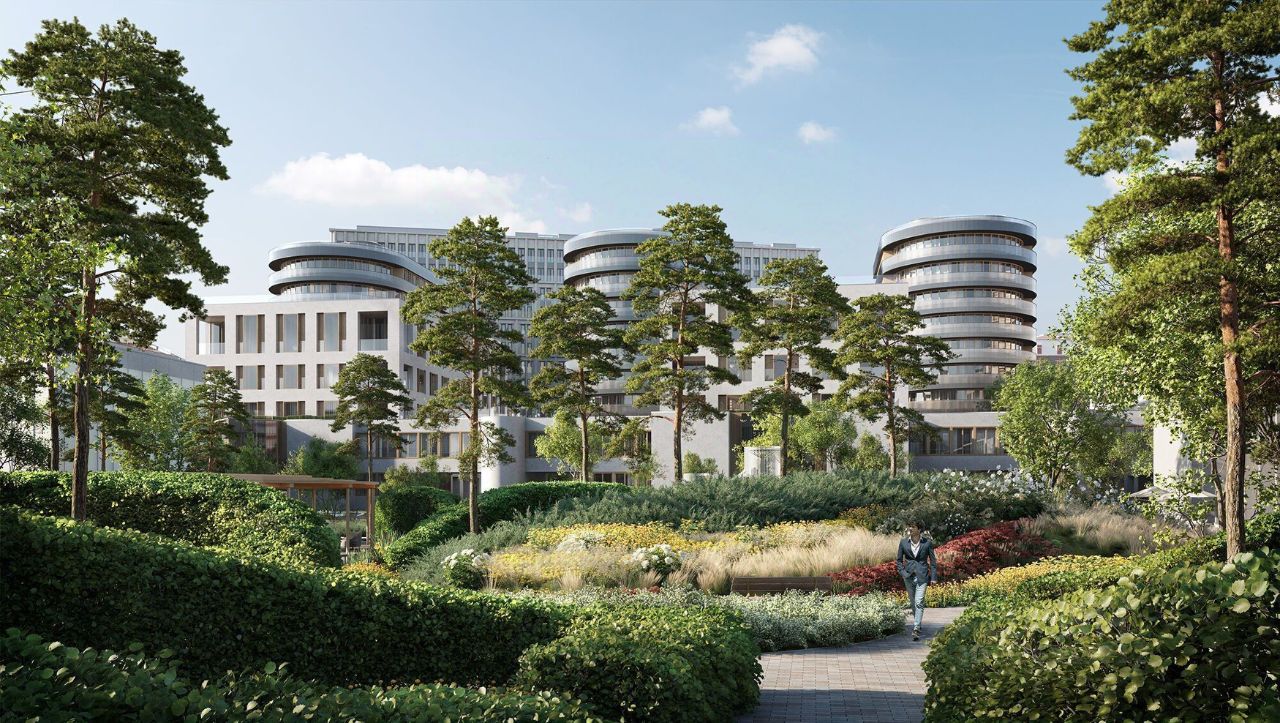 Просторная квартира с тремя мастер-спальнями и панорамными окнами на три стороны света, с балконов которых откроются виды на цветущий сад и витражный парк с соснами.