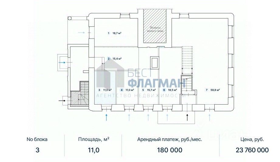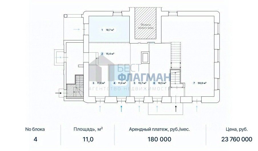 Арт. 129260483 Описание Аренда помещения свободного назначения 11 кв.м. Высота потолков — 3,25 м, мокрая точка, современная входная группа, вывеска, свободная планировка. Отлично подойдут под любой вид деятельности: торговое помещение, кафе, аптека, салон красоты, банк, офис продаж и др.